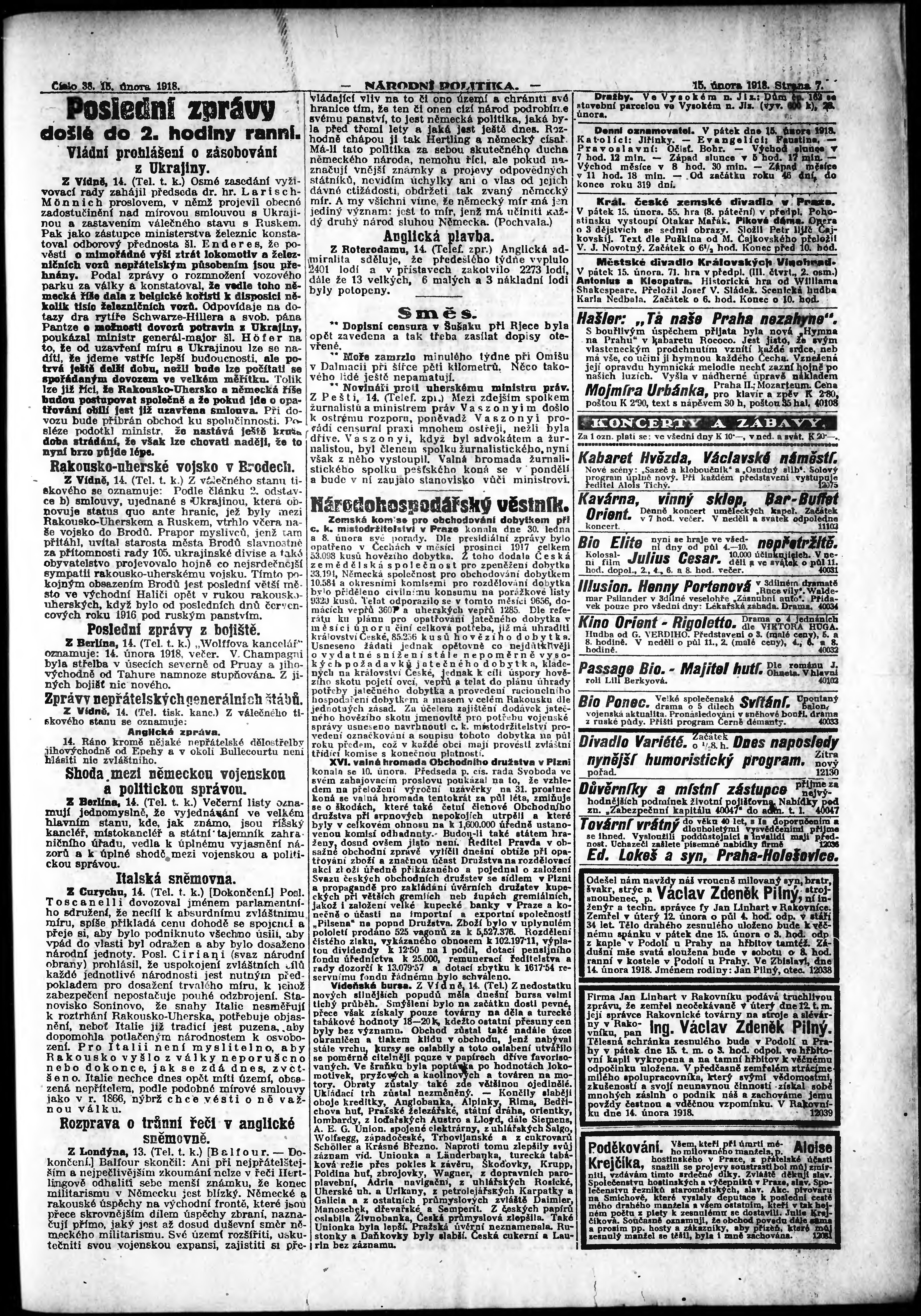 * Datum vydání výtisku: 15.2.1918 Číslo výtisku: 38 Poznámky k výtisku: ranní vydání; vydání pro Prahu;