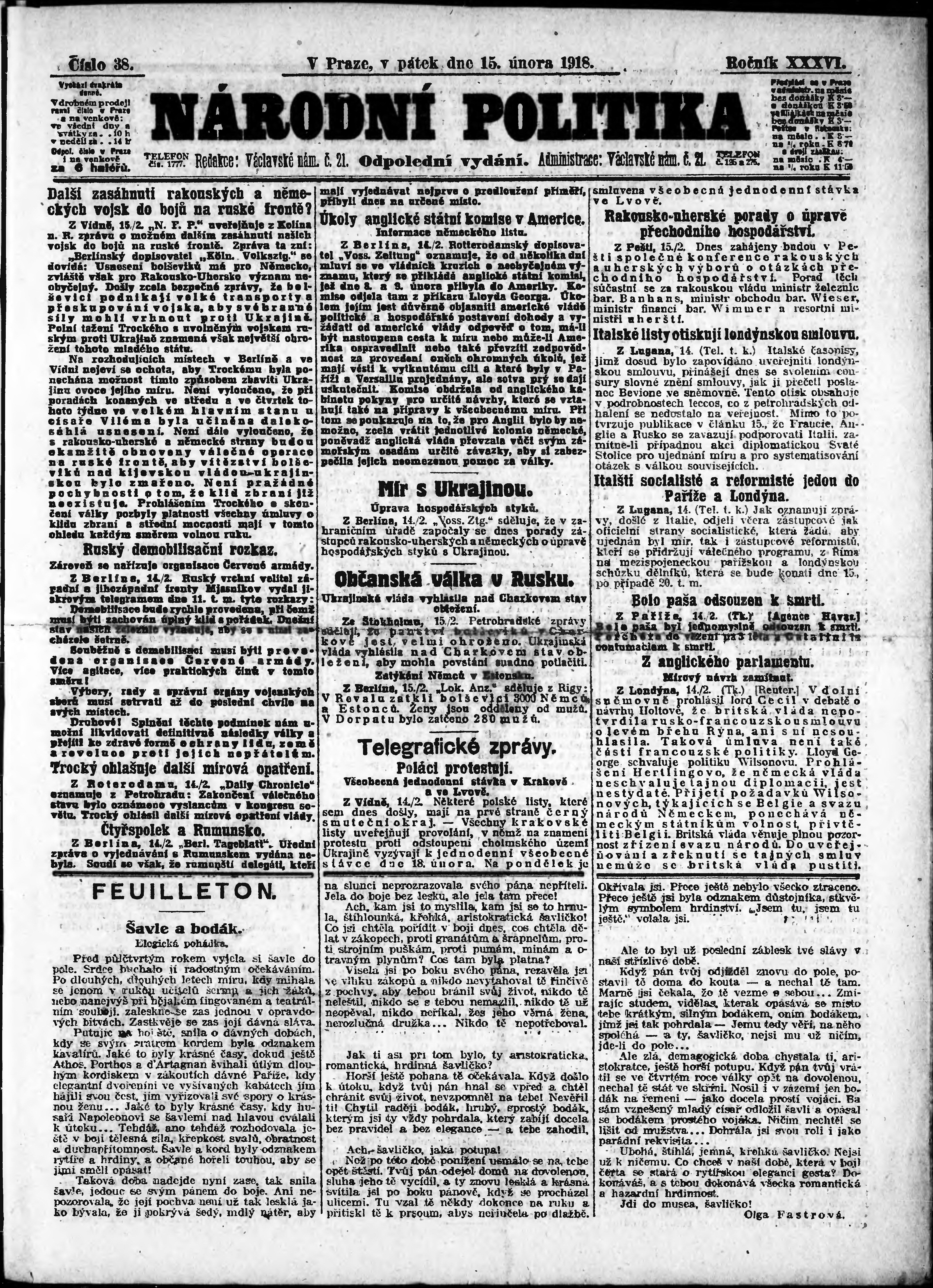 * Datum vydání výtisku: 15.2.1918 Číslo výtisku: 38 Poznámky k výtisku: odpolední vydání;