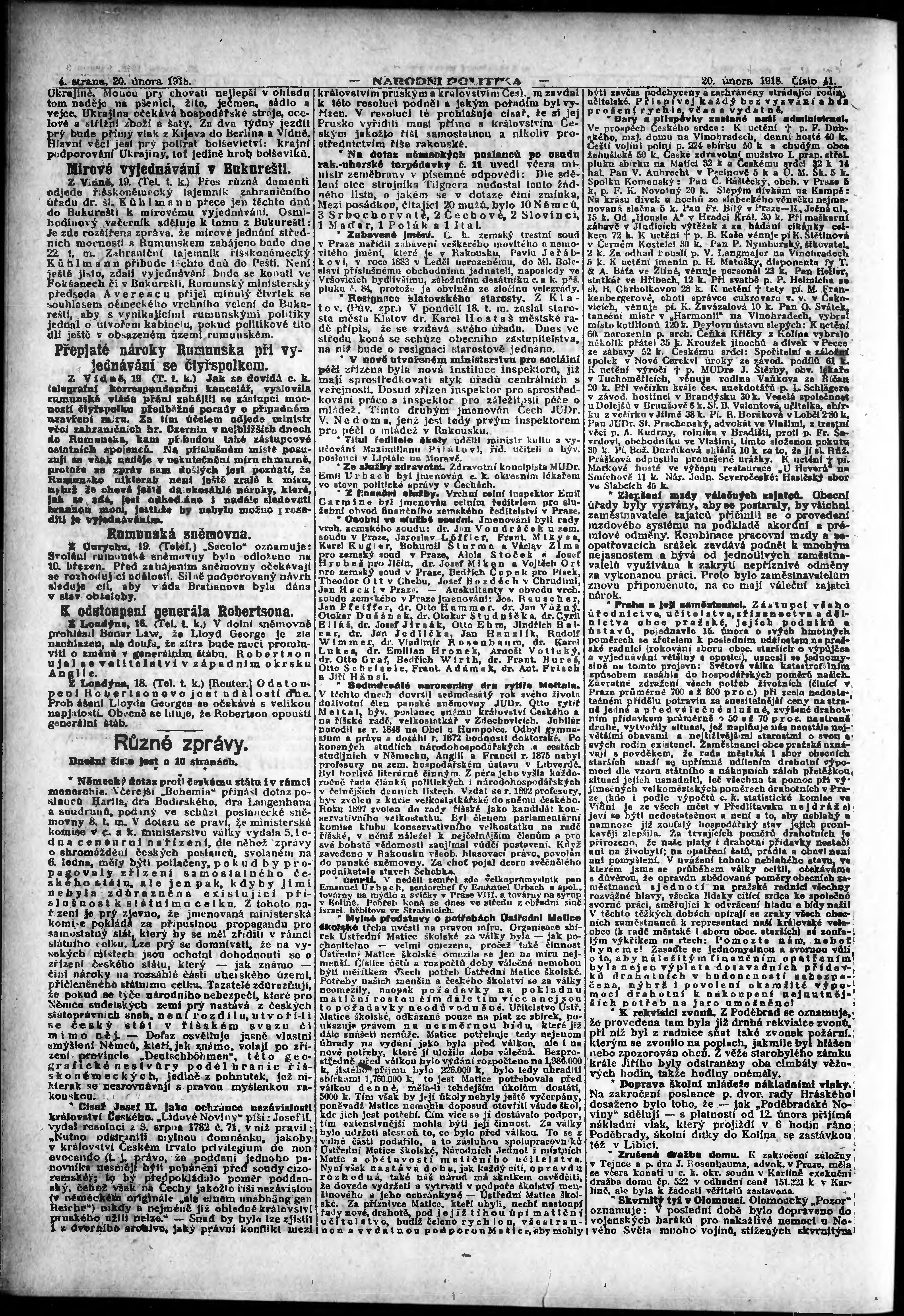 * Datum vydání výtisku: 20.2.1918 Číslo výtisku: 42 Poznámky k výtisku: ranní vydání; vydání pro Prahu;