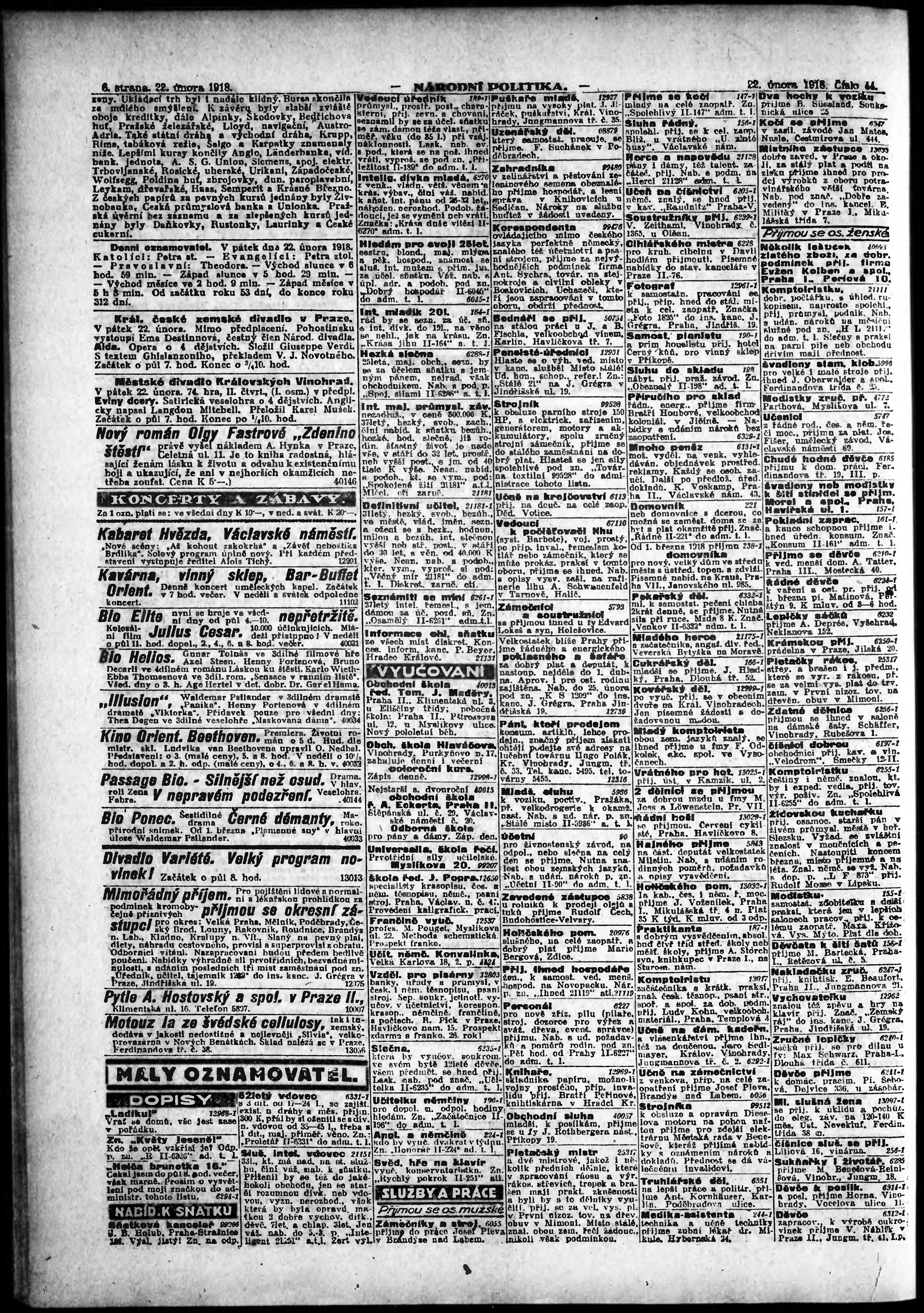 * Datum vydání výtisku: 22.2.1918 Číslo výtisku: 44 Poznámky k výtisku: ranní vydání; vydání pro Prahu;