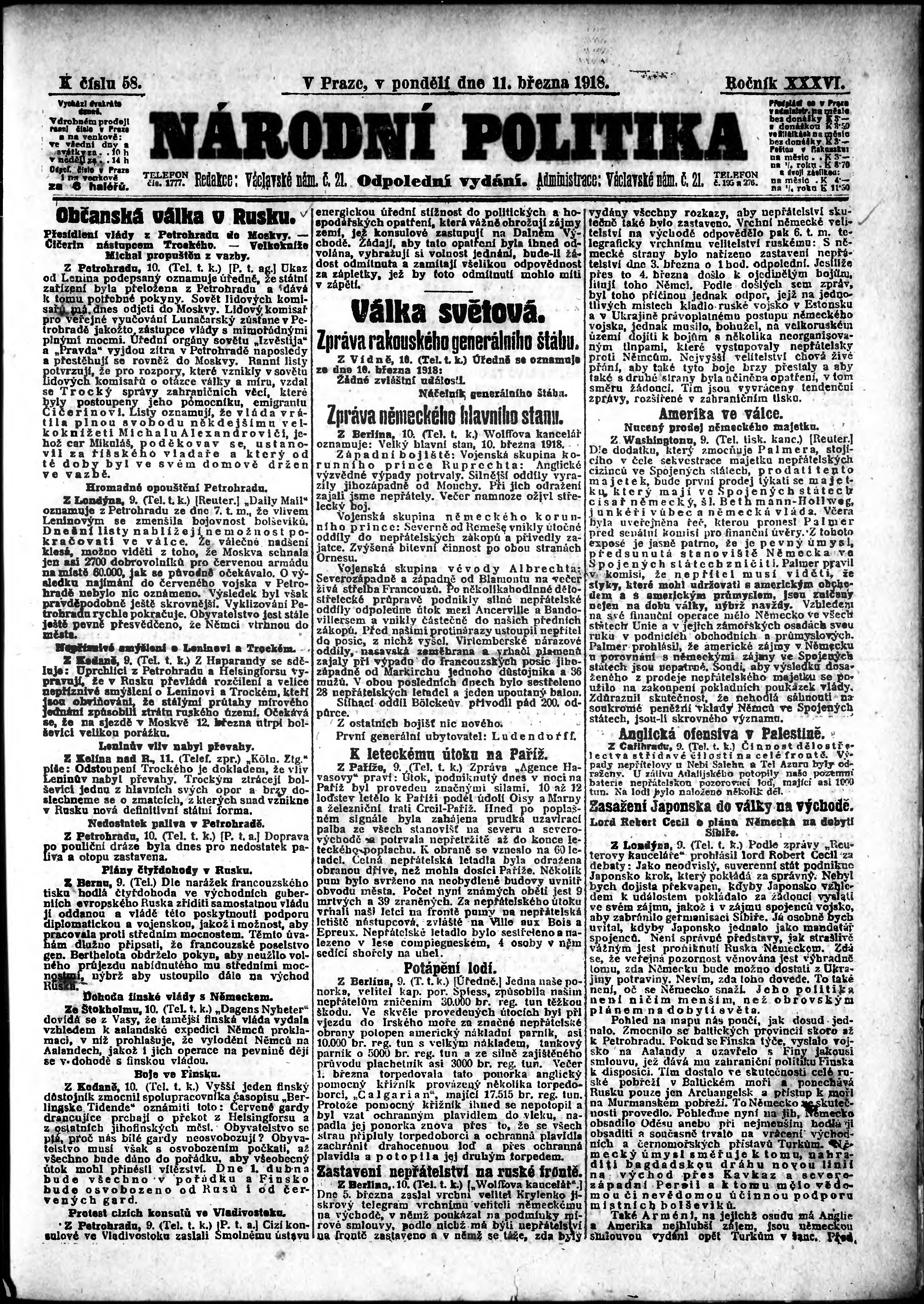* Datum vydání výtisku: 11.3.1918 Číslo výtisku: 58 Poznámky k výtisku: odpolední vydání;