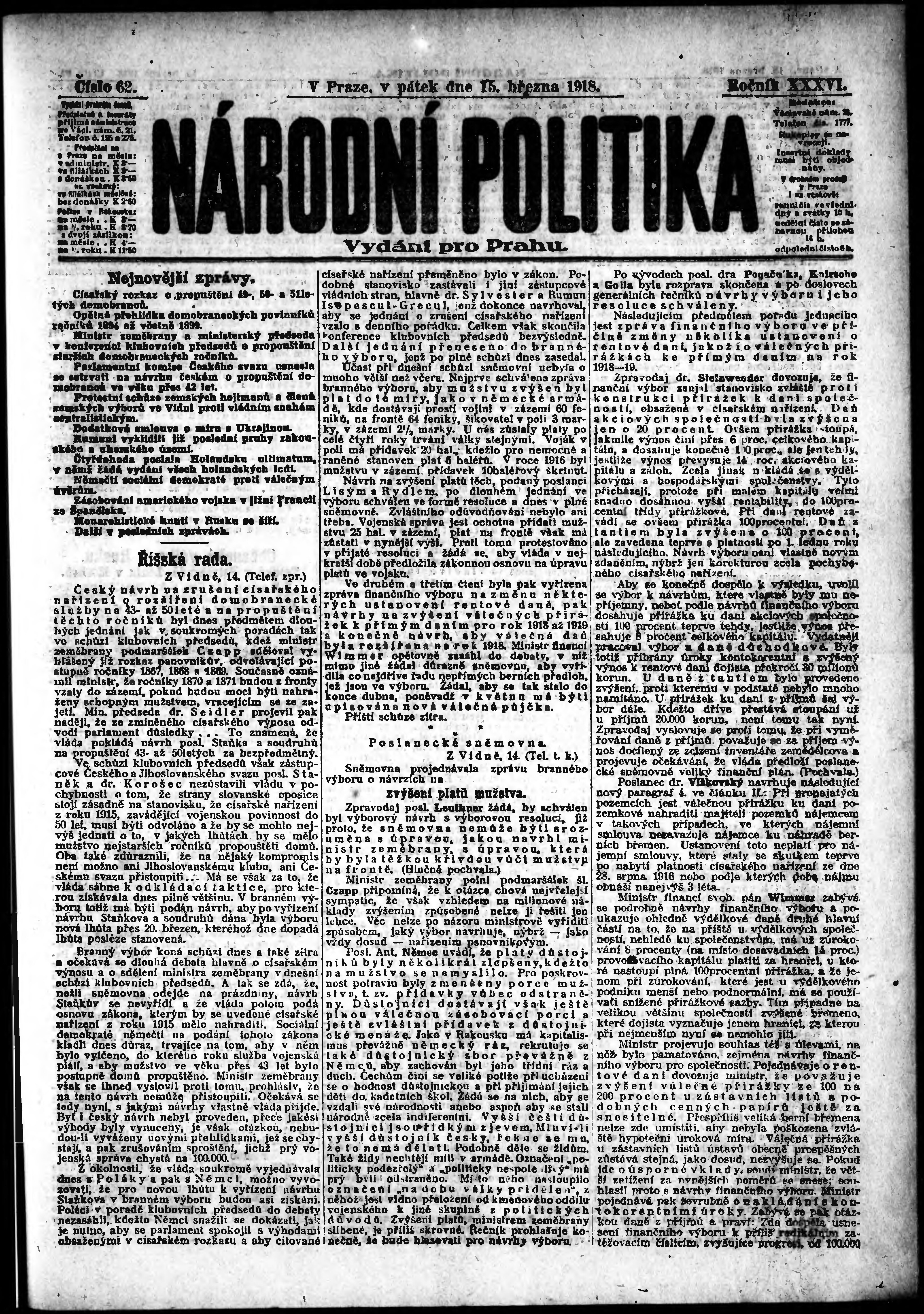 * Datum vydání výtisku: 15.3.1918 Číslo výtisku: 62 Poznámky k výtisku: ranní vydání; vydání pro Prahu; od s. 9 není k dispozici;