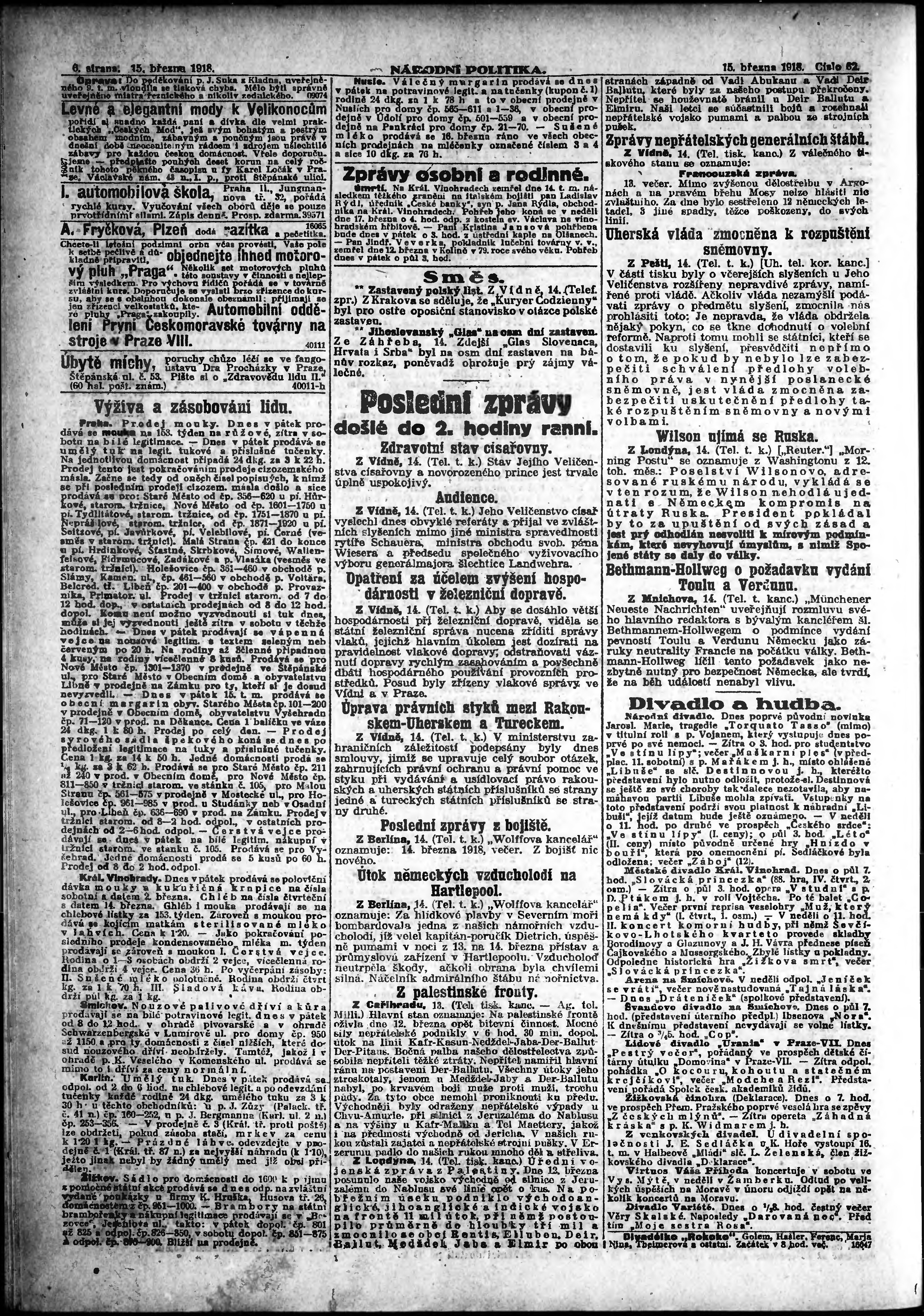* Datum vydání výtisku: 15.3.1918 Číslo výtisku: 62 Poznámky k výtisku: ranní vydání; vydání pro Prahu; od s. 9 není k dispozici;