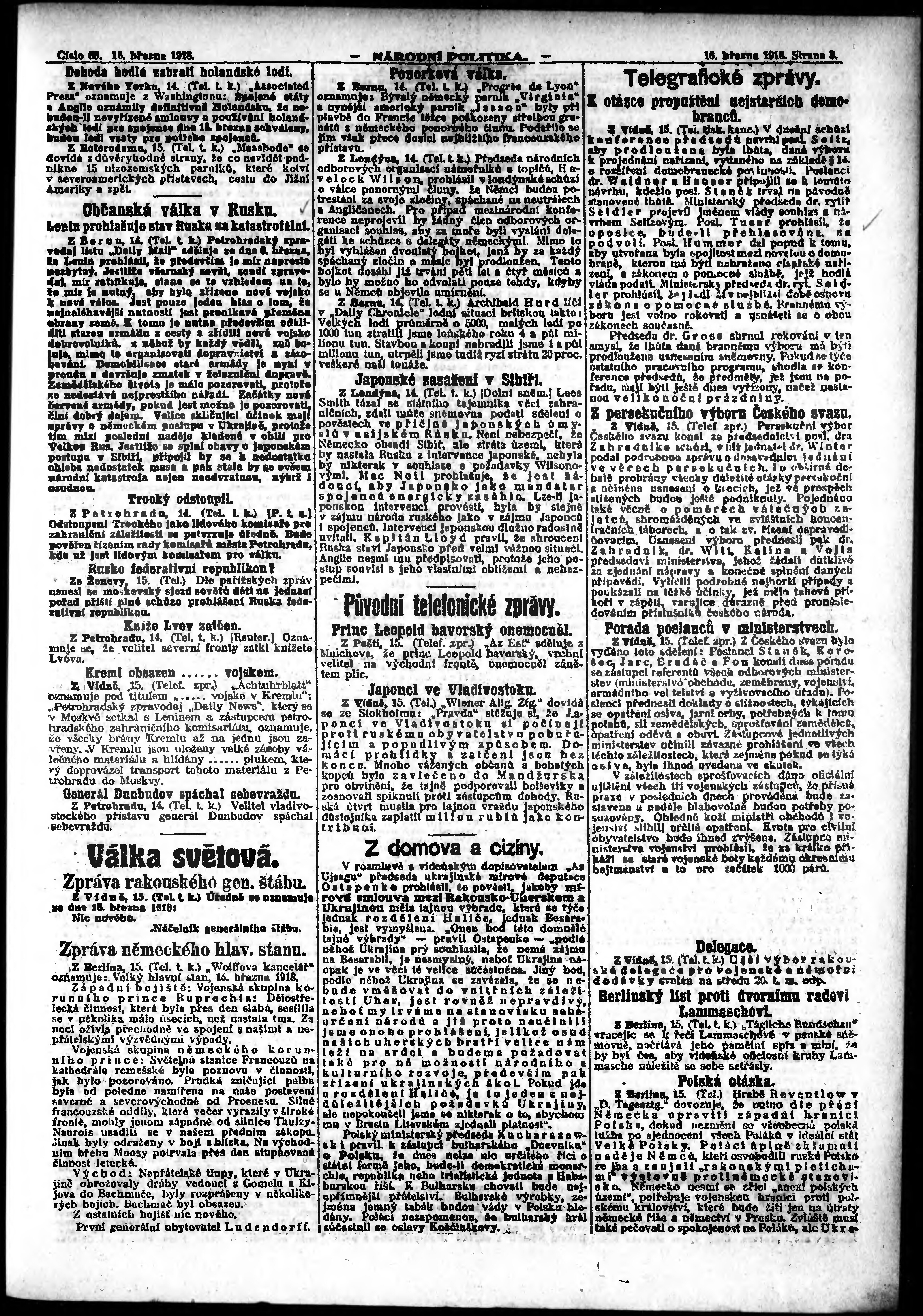 * Datum vydání výtisku: 16.3.1918 Číslo výtisku: 63 Poznámky k výtisku: ranní vydání; vydání pro Prahu;