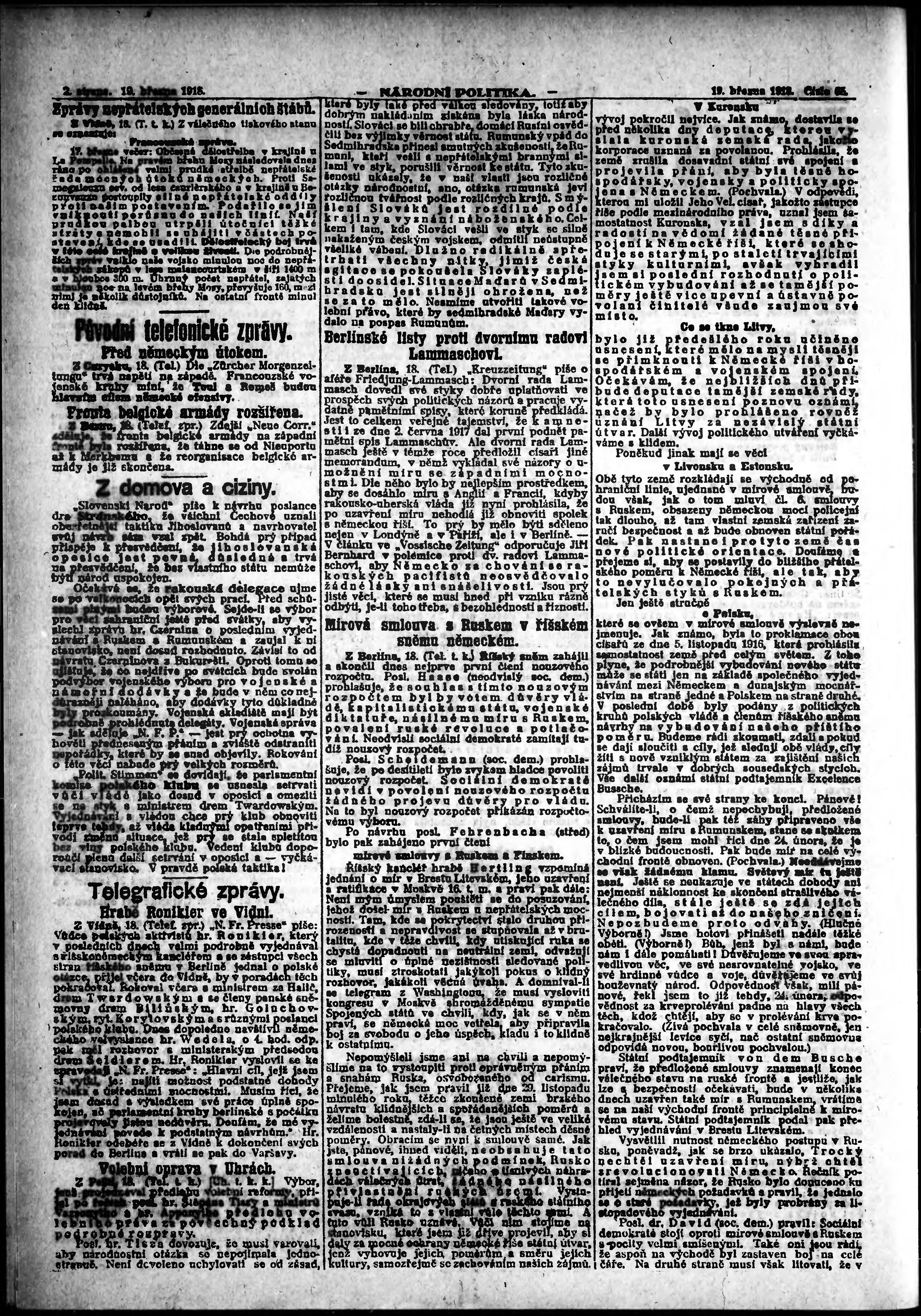 * Datum vydání výtisku: 19.3.1918 Číslo výtisku: 65 Poznámky k výtisku: ranní vydání; vydání pro Prahu; od s. 7 není k dispozici;