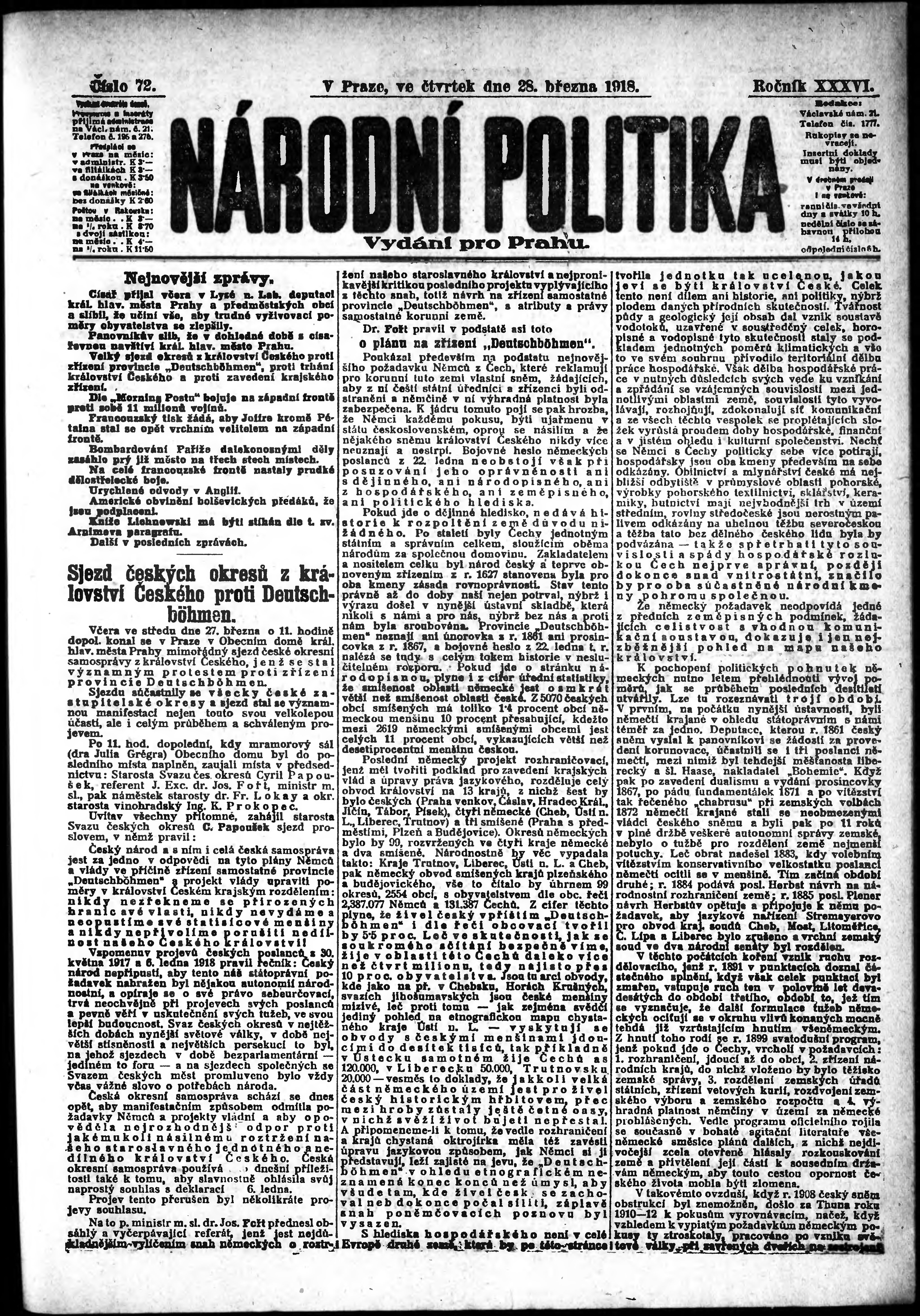 * Datum vydání výtisku: 28.3.1918 Číslo výtisku: 72 Poznámky k výtisku: ranní vydání; vydání pro Prahu; od s. 9 není k dispozici;