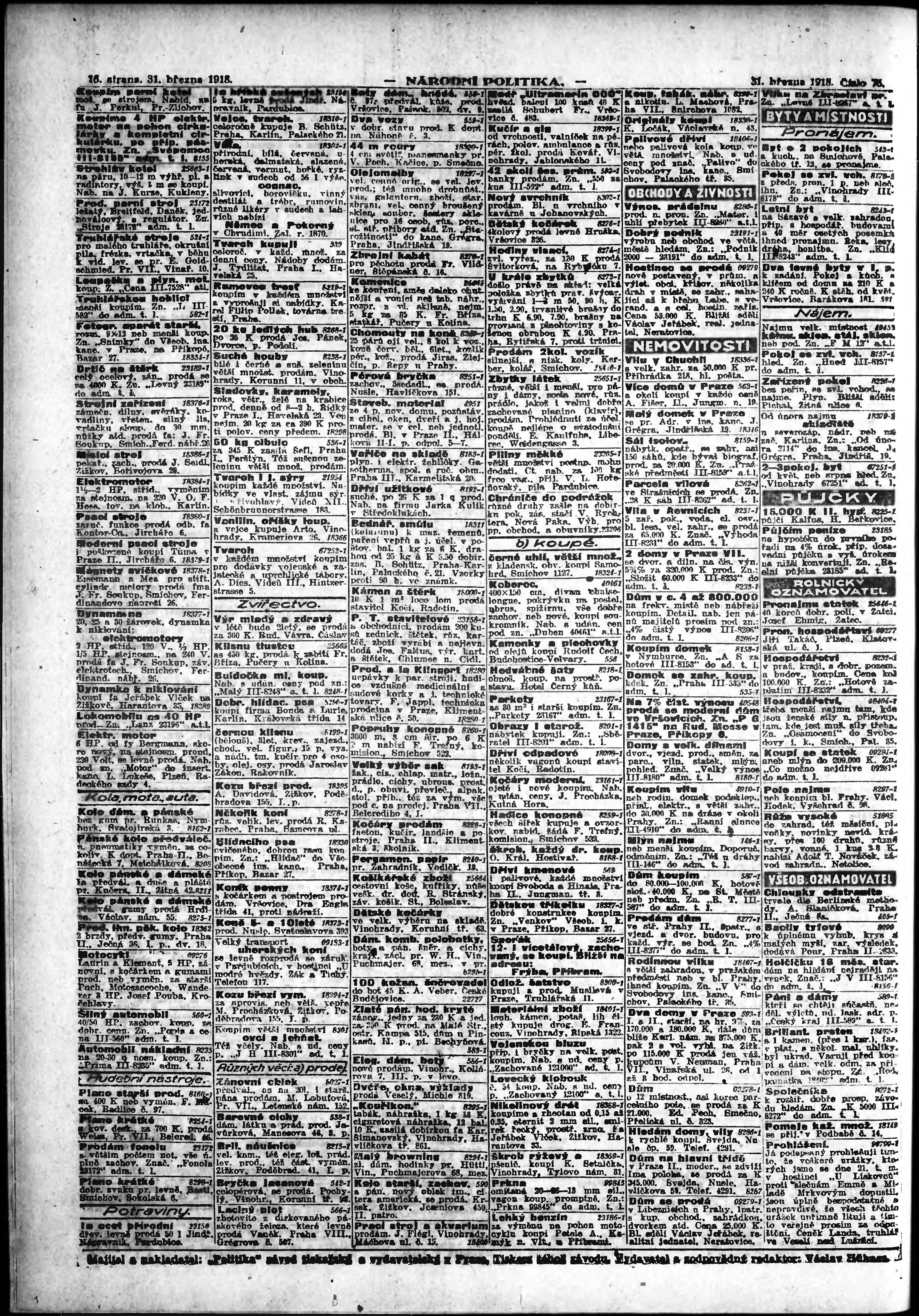 * Datum vydání výtisku: 31.3.1918 Číslo výtisku: 75 Poznámky k výtisku: ranní vydání;