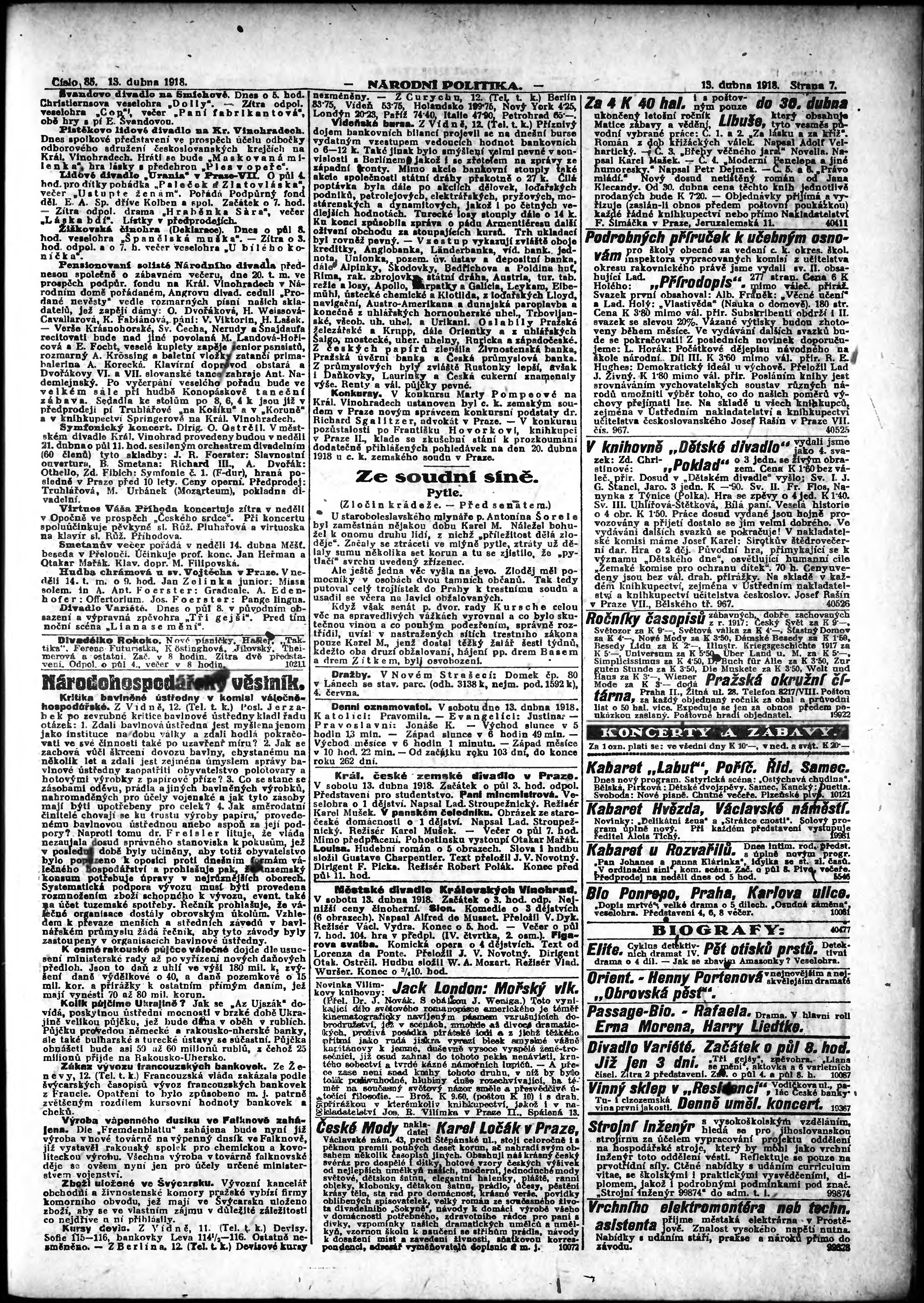* Datum vydání výtisku: 13.4.1918 Číslo výtisku: 85 Poznámky k výtisku: ranní vydání; vydání pro Prahu;