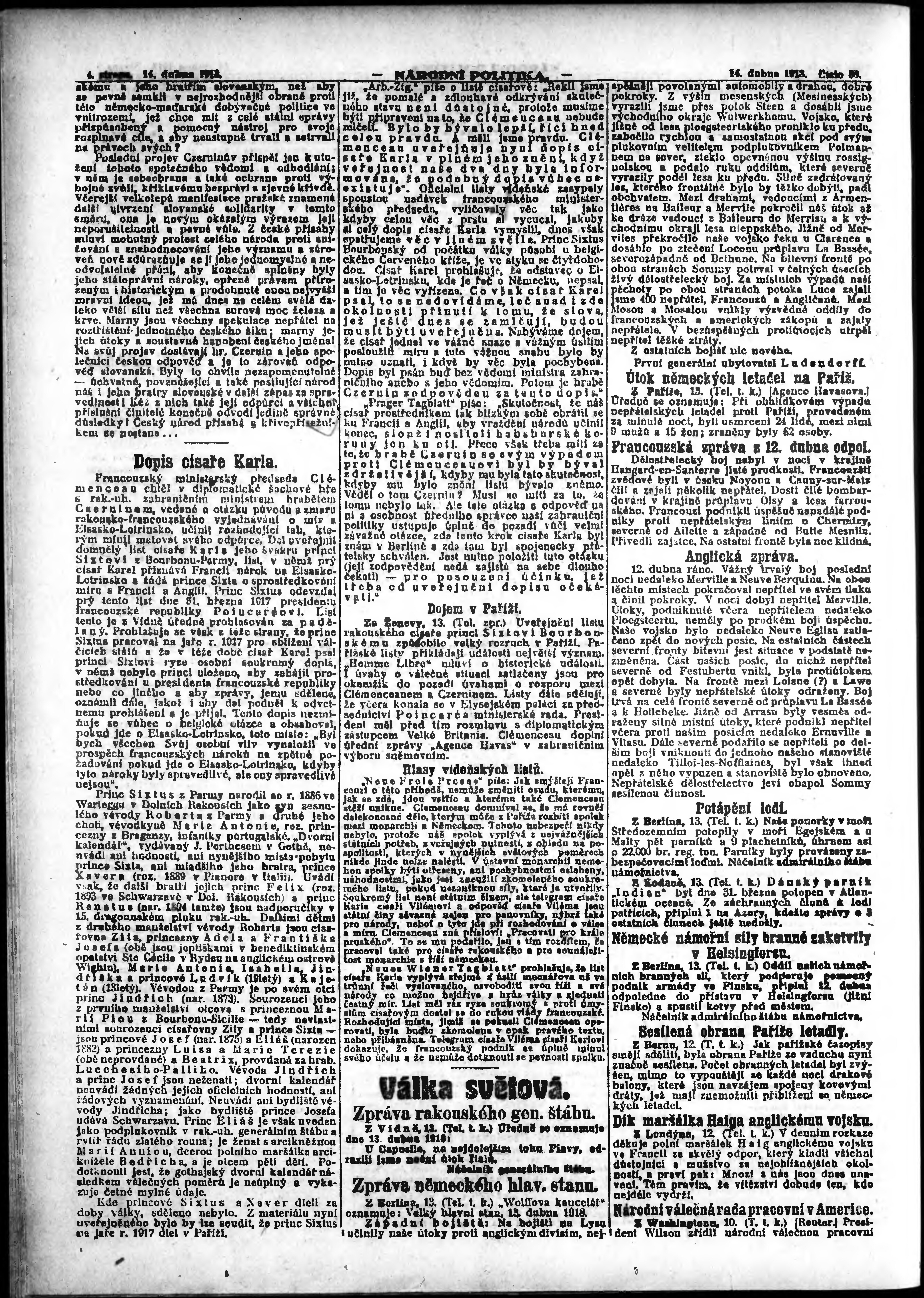 * Datum vydání výtisku: 14.4.1918 Číslo výtisku: 86 Poznámky k výtisku: ranní vydání;