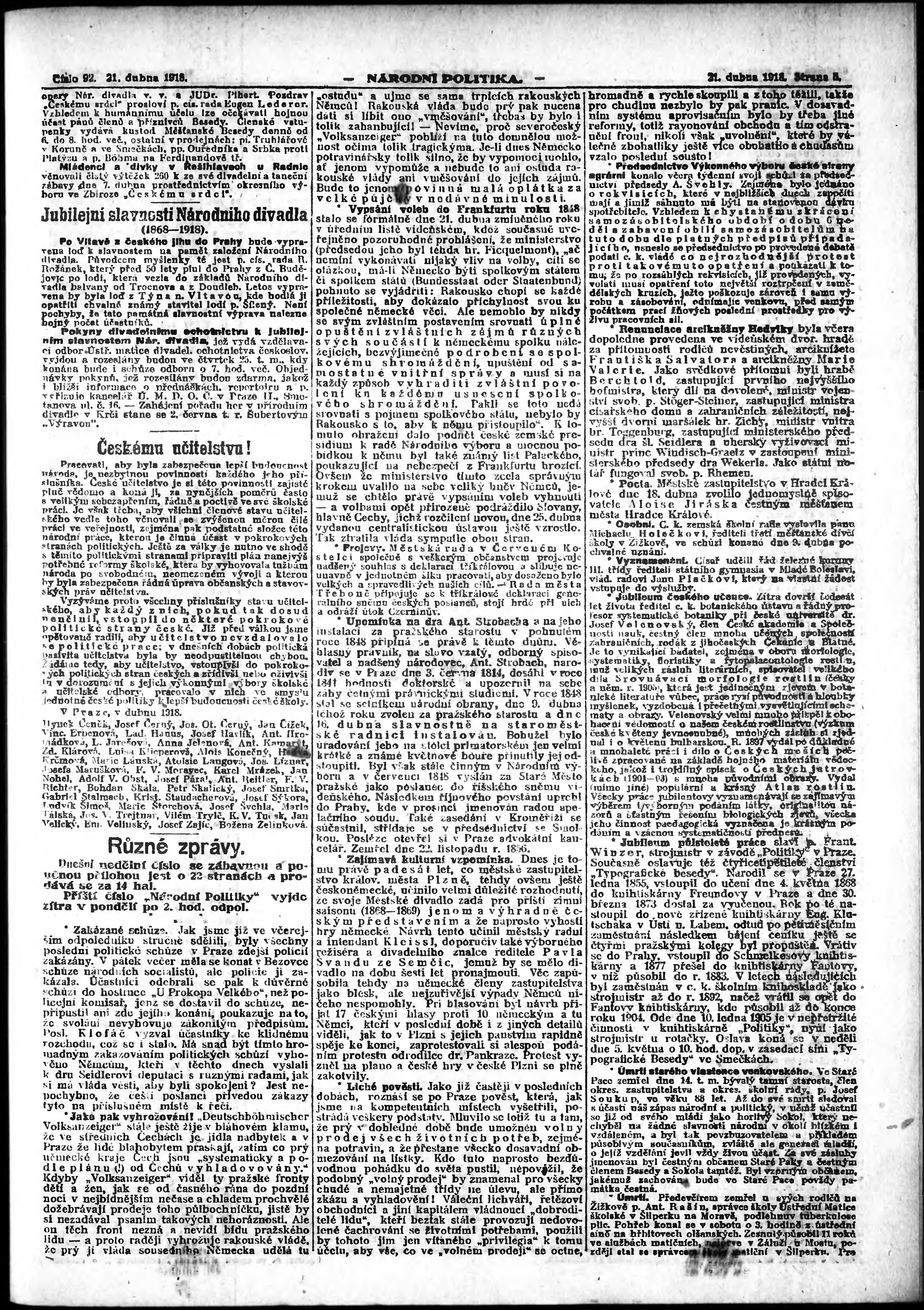 * Datum vydání výtisku: 21.4.1918 Číslo výtisku: 92 Poznámky k výtisku: ranní vydání;