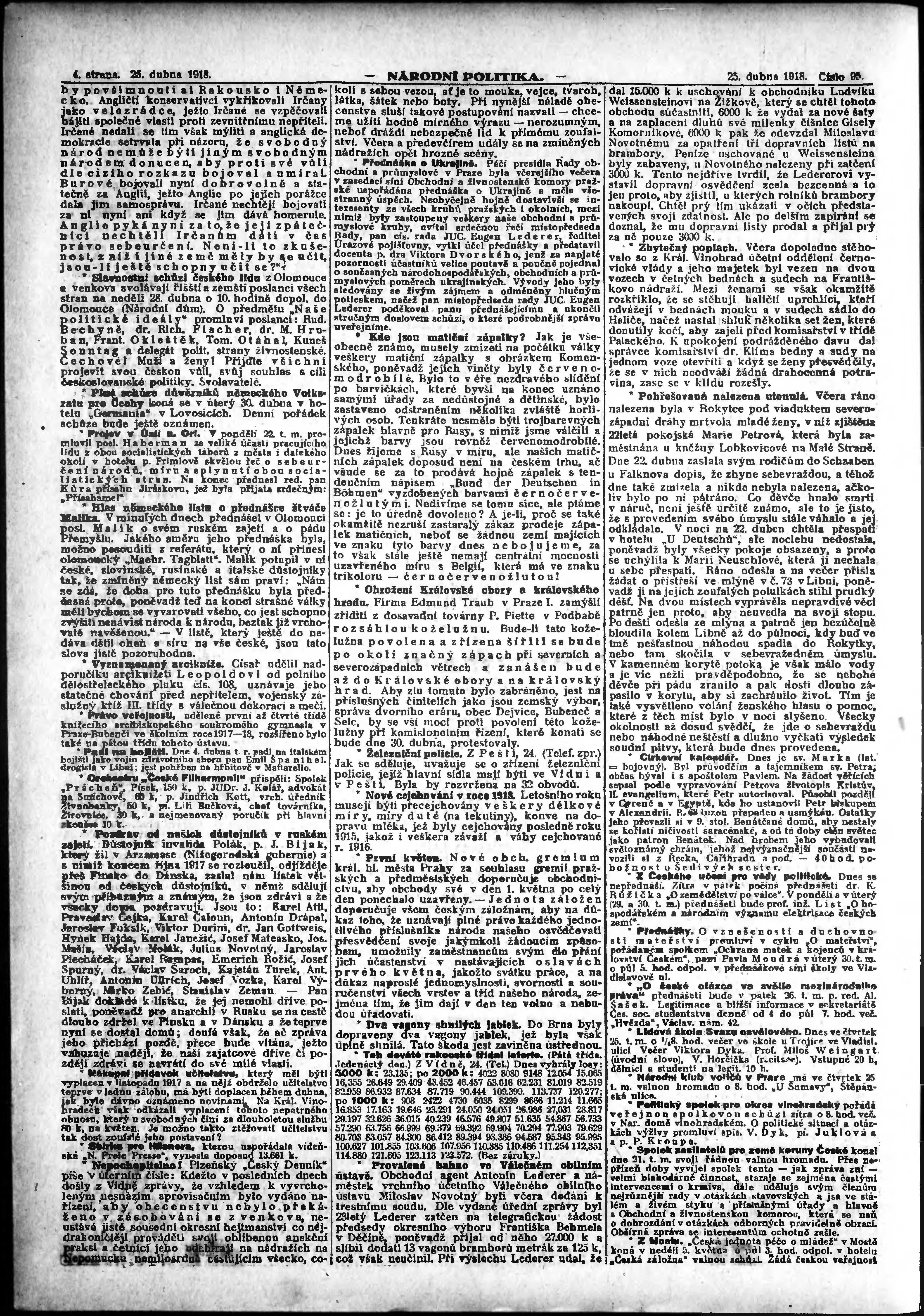 * Datum vydání výtisku: 25.4.1918 Číslo výtisku: 95 Poznámky k výtisku: ranní vydání; vydání pro Prahu;