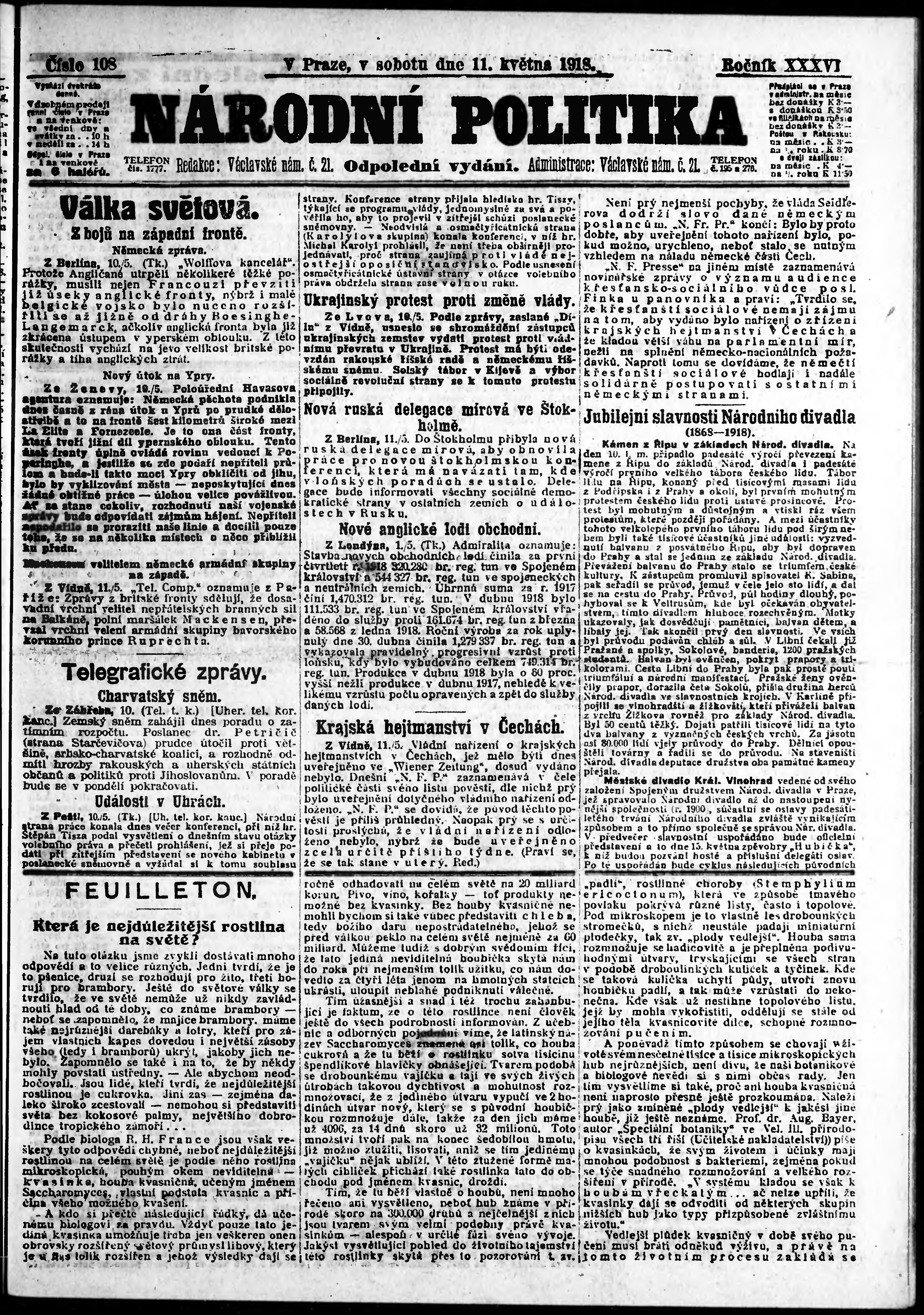 * Datum vydání výtisku: 11.5.1918 Číslo výtisku: 108 Poznámky k výtisku: odpolední vydání;