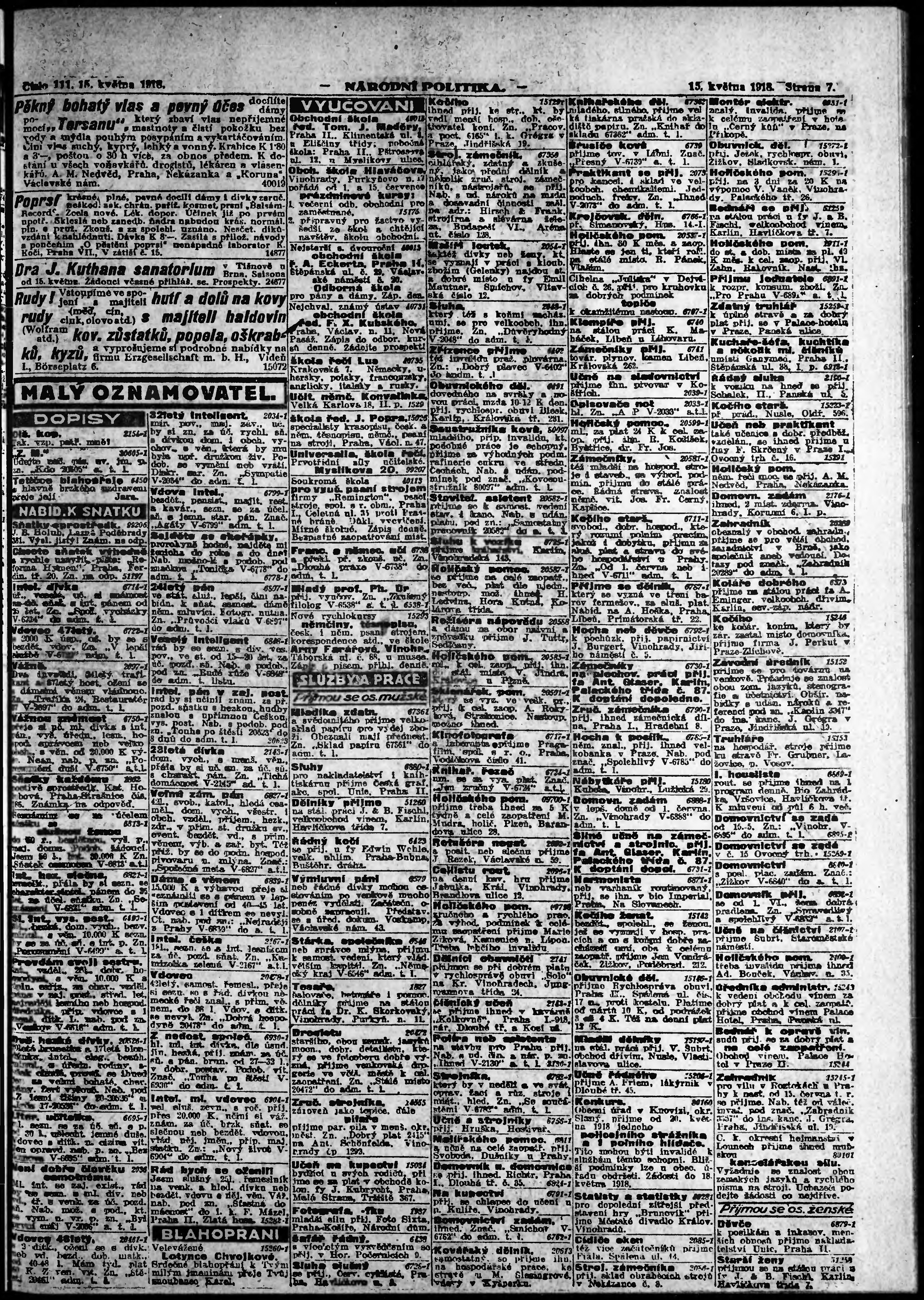 * Datum vydání výtisku: 15.5.1918 Číslo výtisku: 111 Poznámky k výtisku: ranní vydání; vydání pro Prahu;