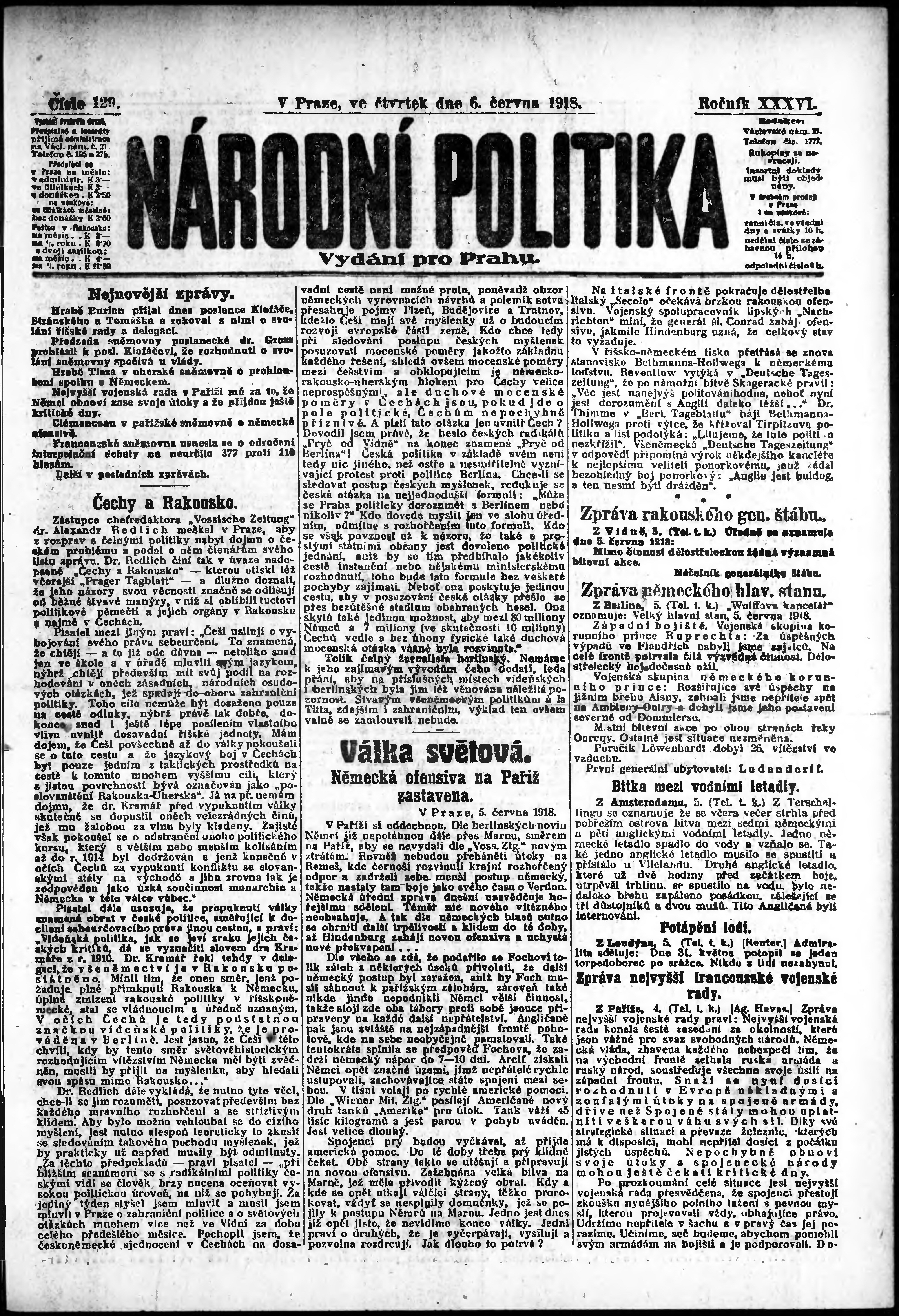 * Datum vydání výtisku: 6.6.1918 Číslo výtisku: 129 Poznámky k výtisku: ranní vydání; vydání pro Prahu;