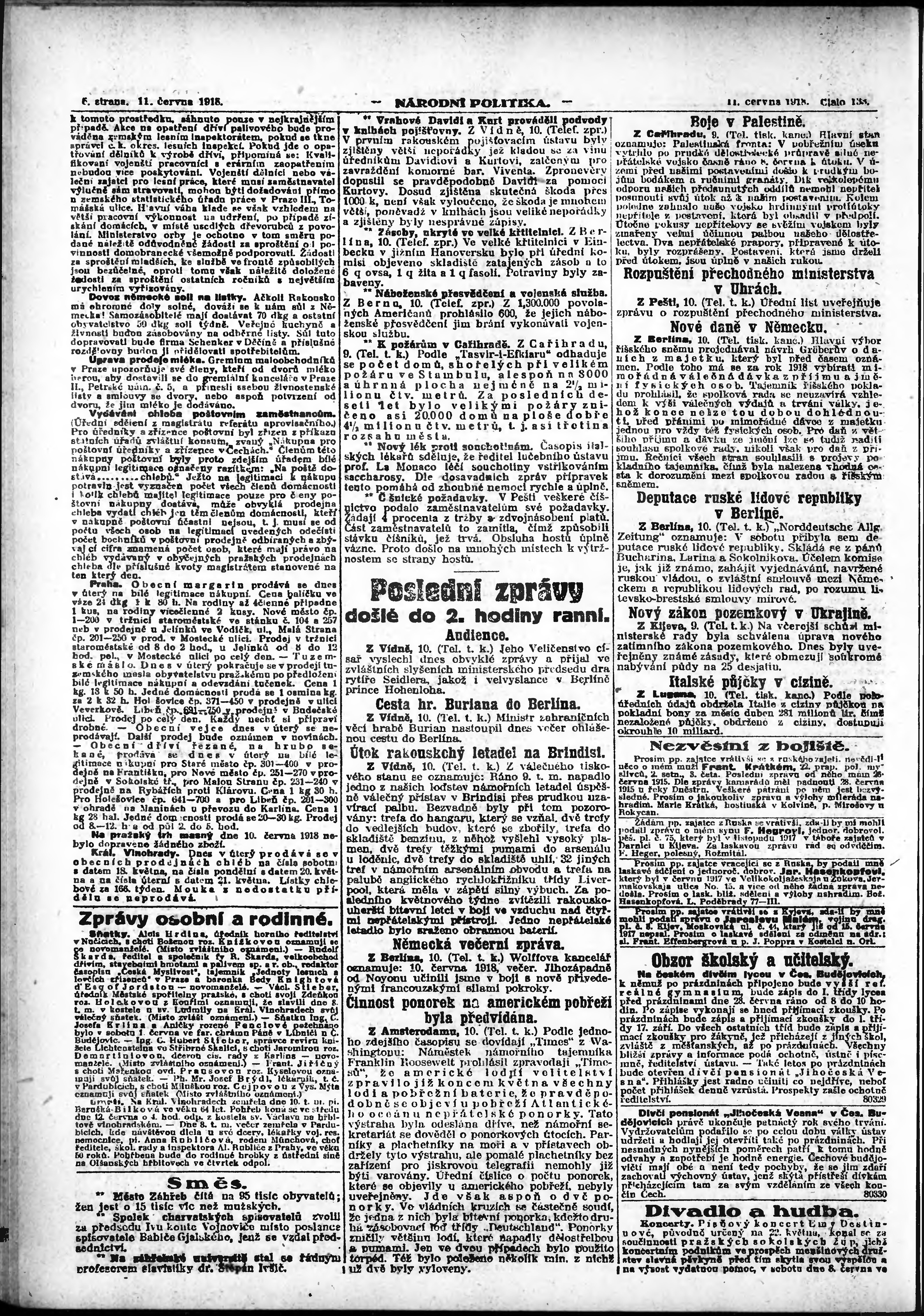 * Datum vydání výtisku: 11.6.1918 Číslo výtisku: 133 Poznámky k výtisku: ranní vydání; vydání pro Prahu;