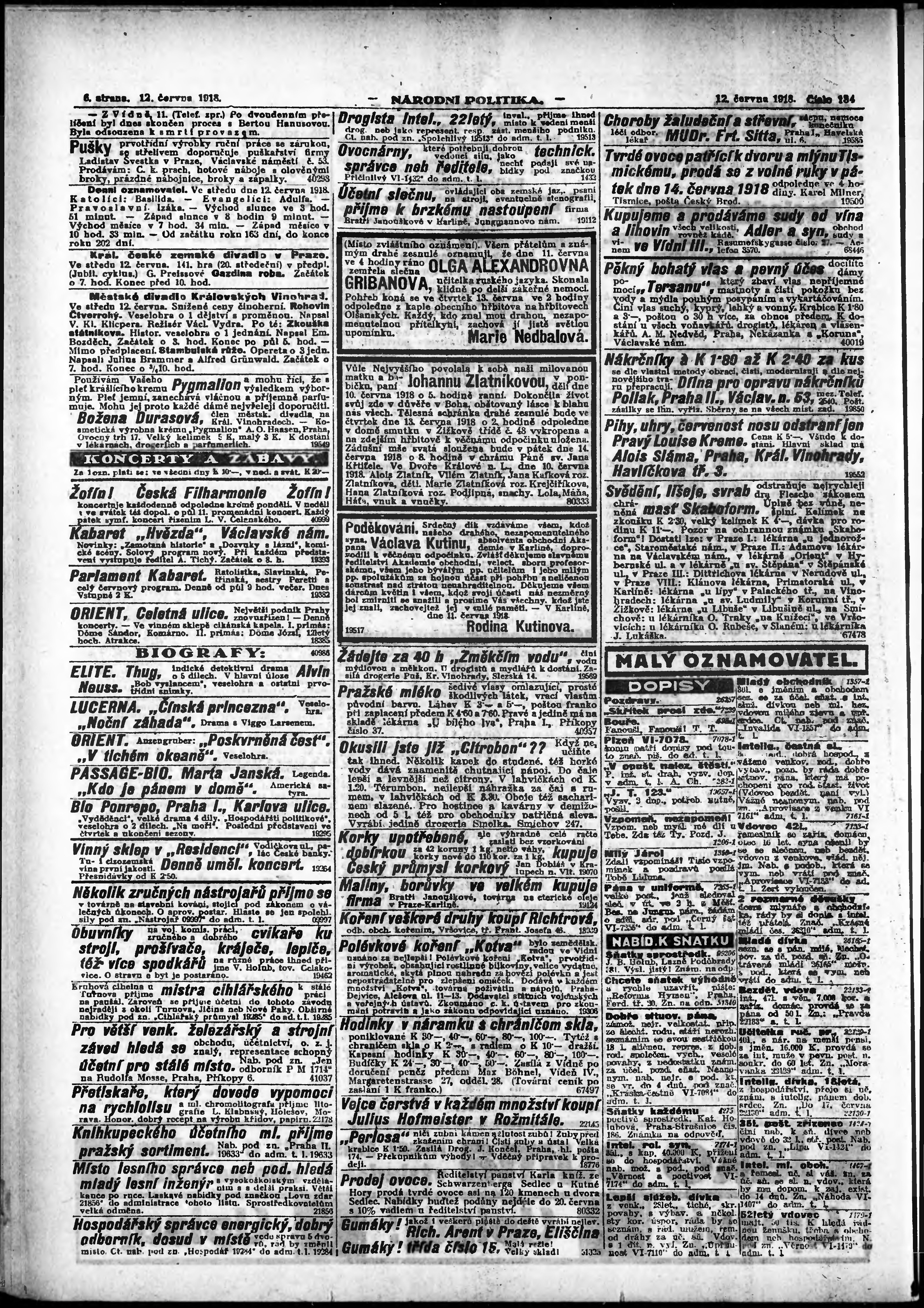 * Datum vydání výtisku: 12.6.1918 Číslo výtisku: 134 Poznámky k výtisku: ranní vydání; vydání pro Prahu;