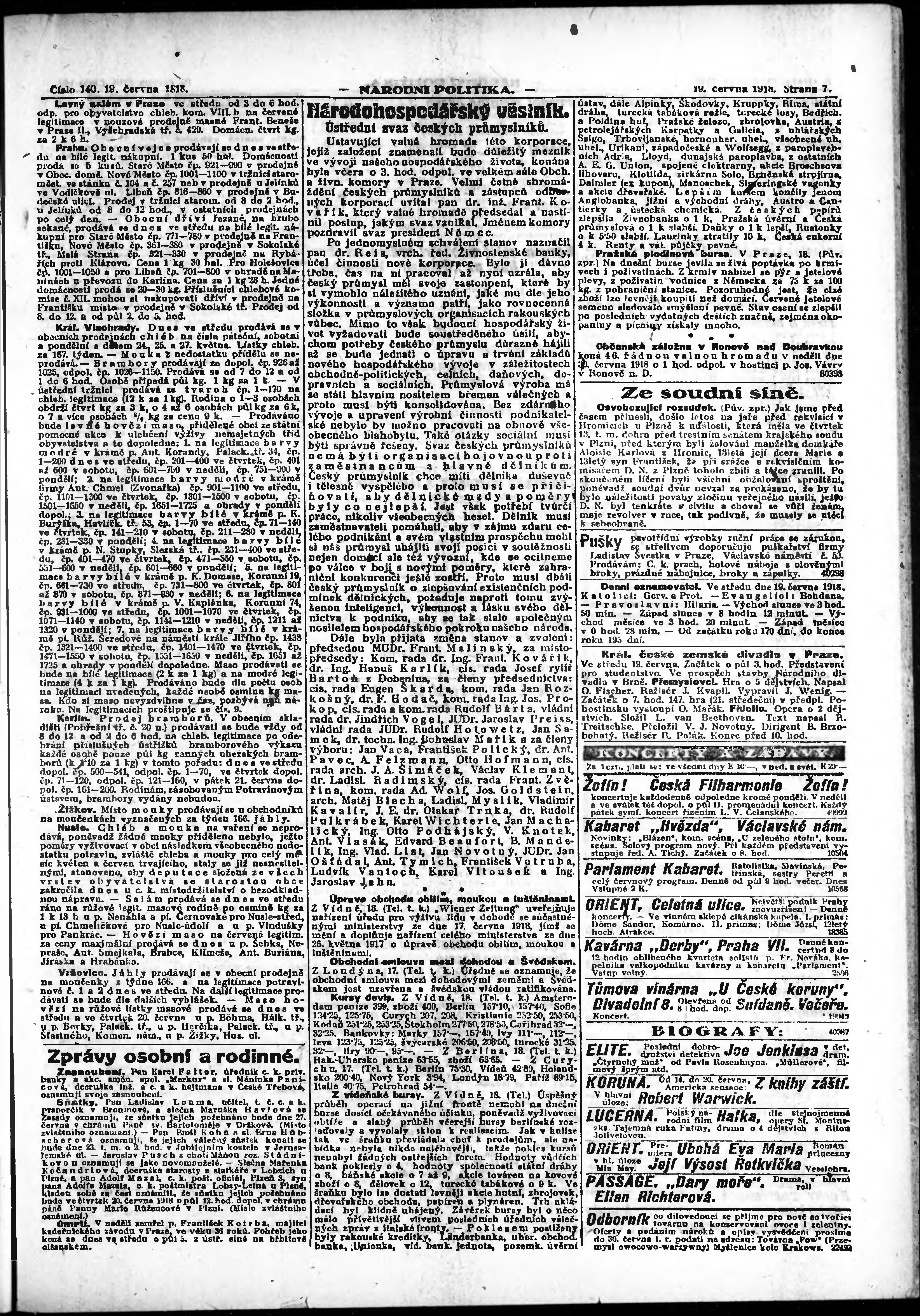 * Datum vydání výtisku: 19.6.1918 Číslo výtisku: 140 Poznámky k výtisku: ranní vydání; vydání pro Prahu;