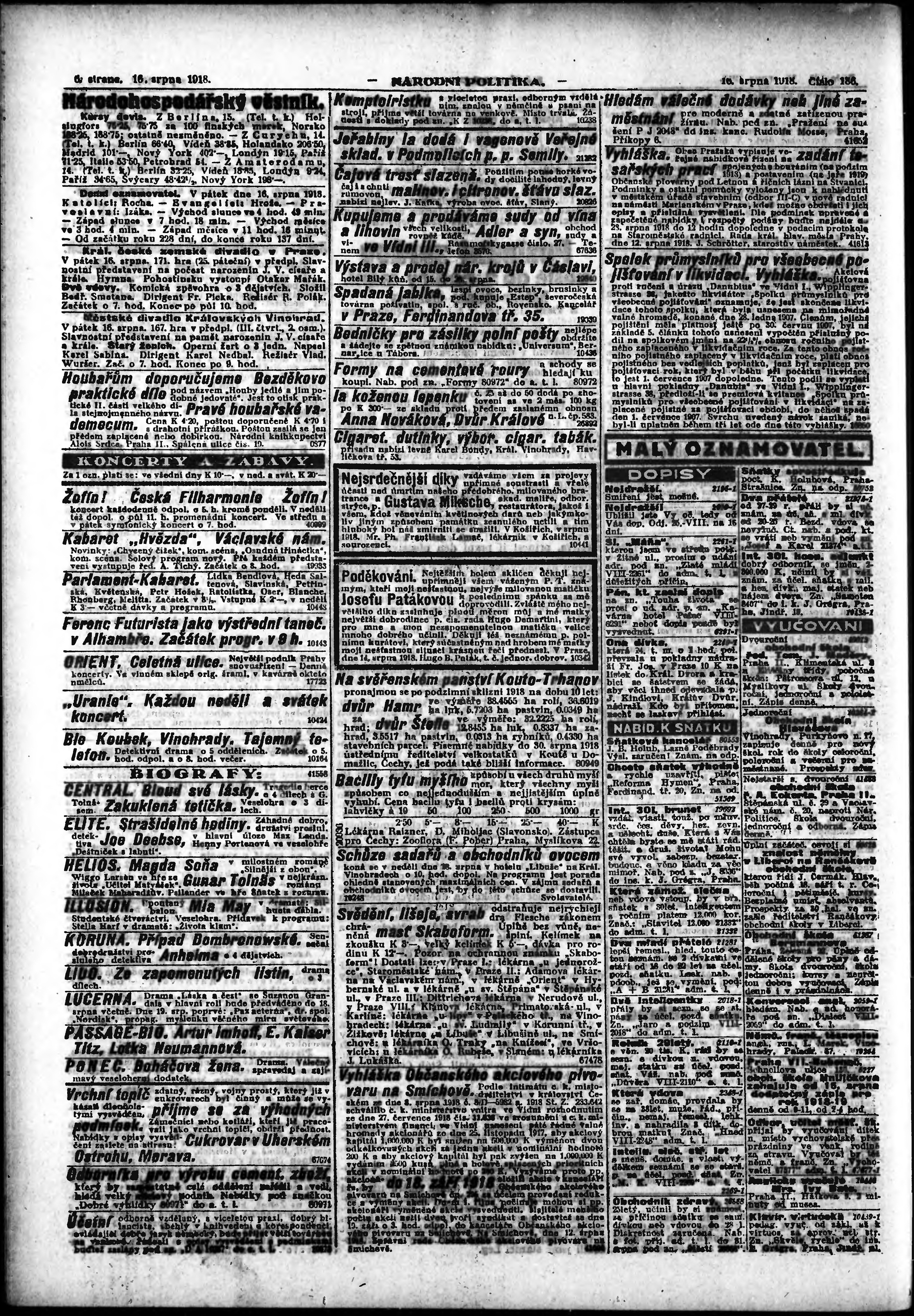 * Datum vydání výtisku: 16.8.1918 Číslo výtisku: 186 Poznámky k výtisku: ranní vydání; vydání pro Prahu;