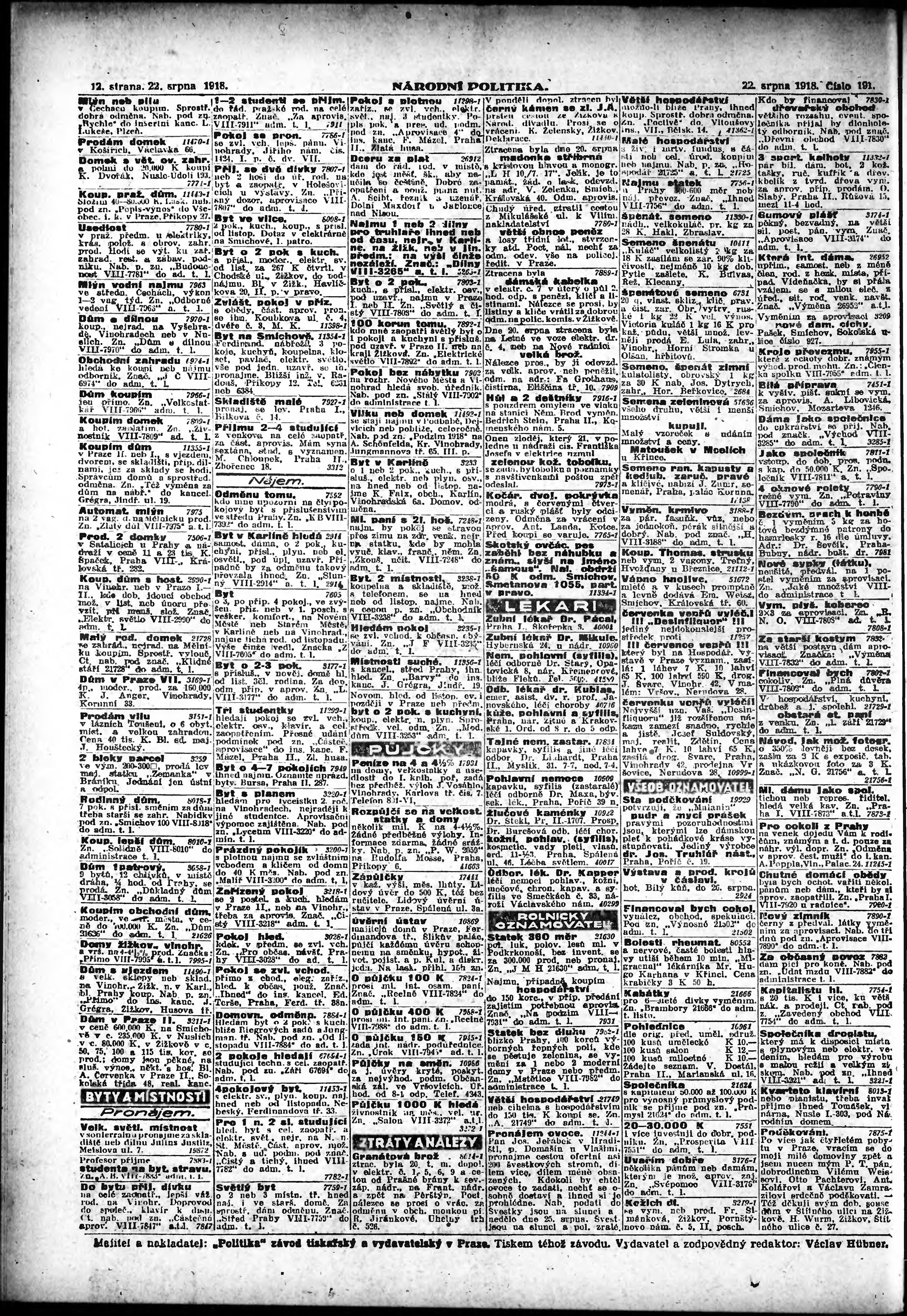 * Datum vydání výtisku: 22.8.1918 Číslo výtisku: 191 Poznámky k výtisku: ranní vydání; vydání pro venkov;