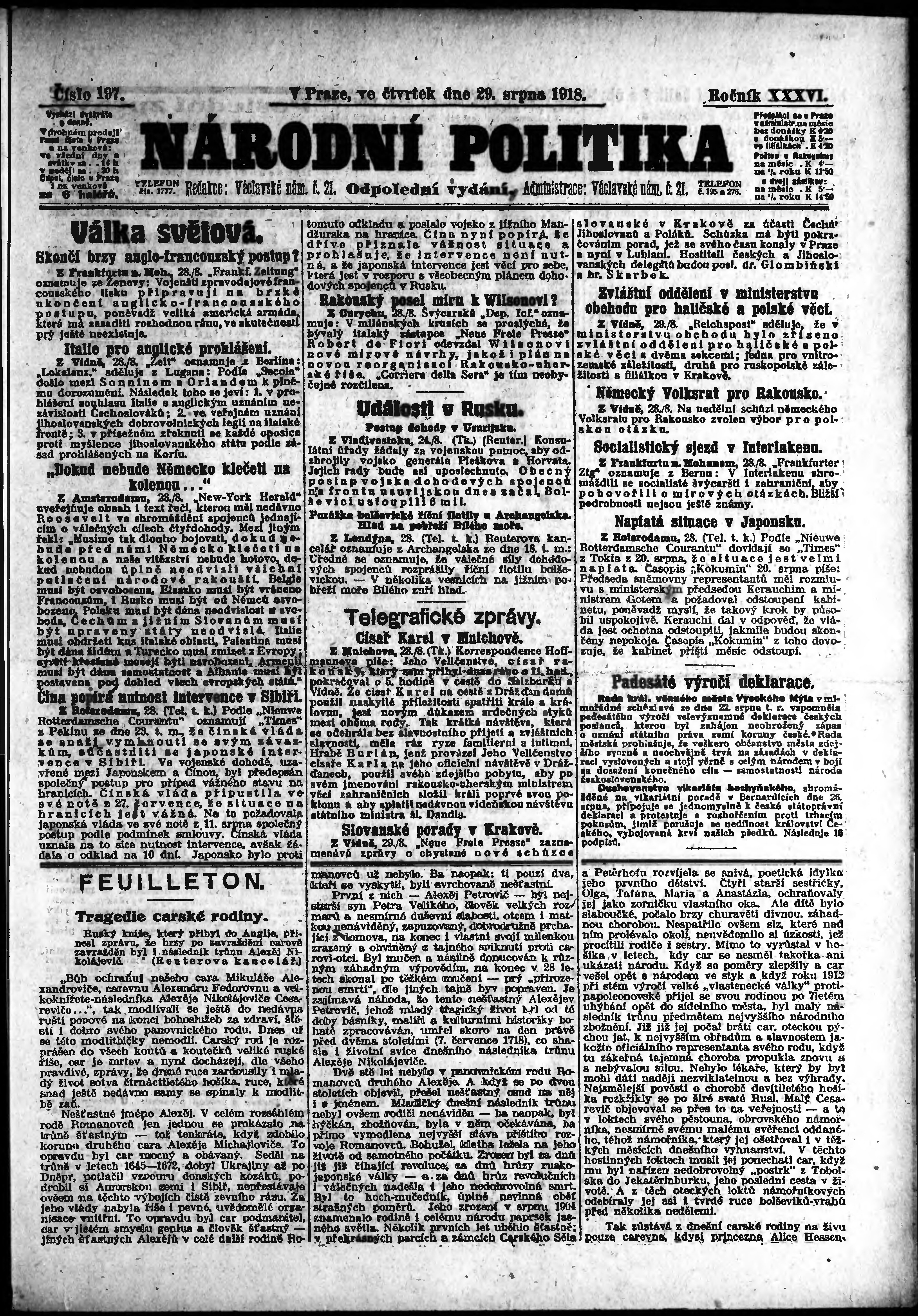 * Datum vydání výtisku: 29.8.1918 Číslo výtisku: 197 Poznámky k výtisku: odpolední vydání;