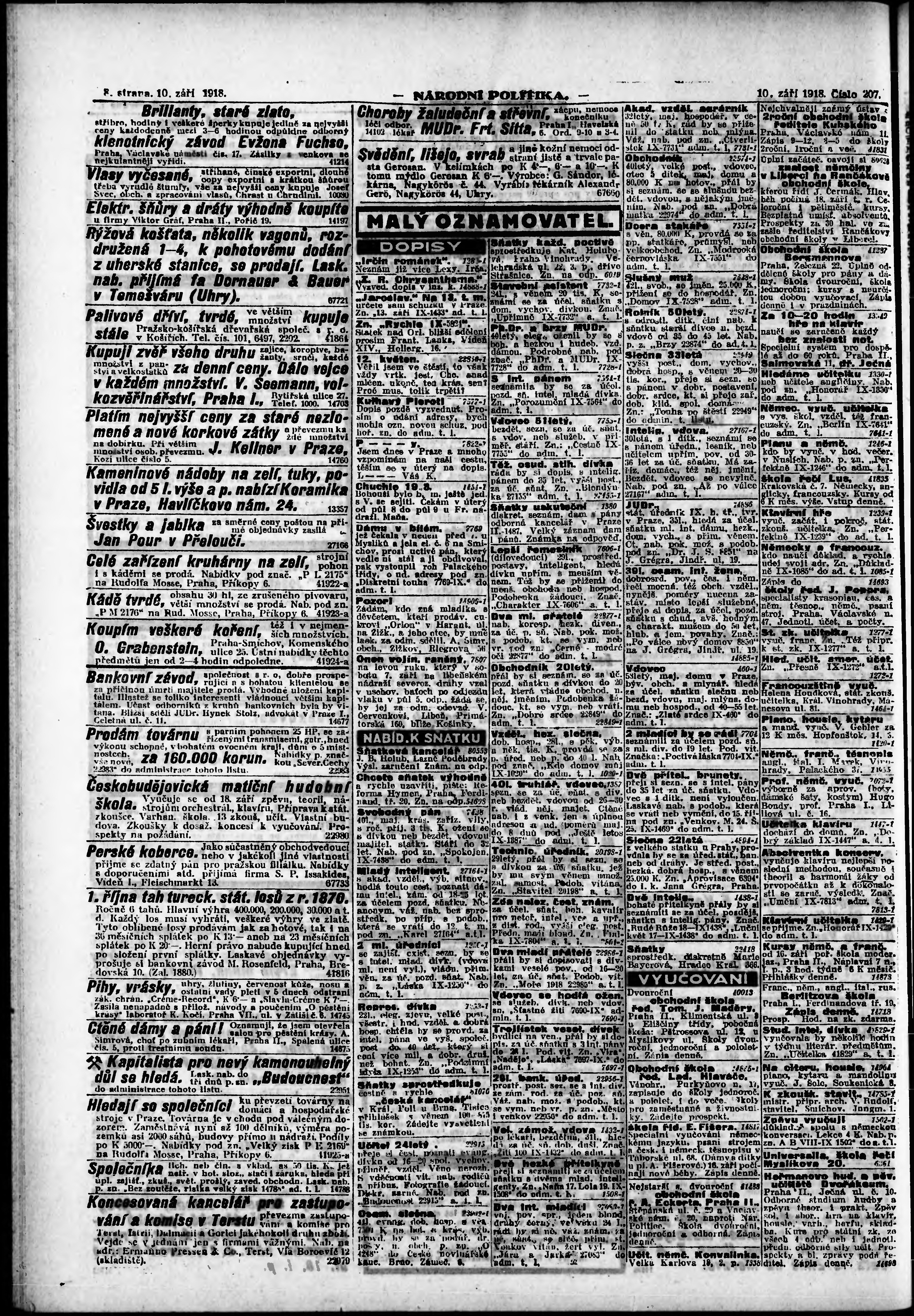 * Datum vydání výtisku: 10.9.1918 Číslo výtisku: 207 Poznámky k výtisku: ranní vydání; vydání pro Prahu;
