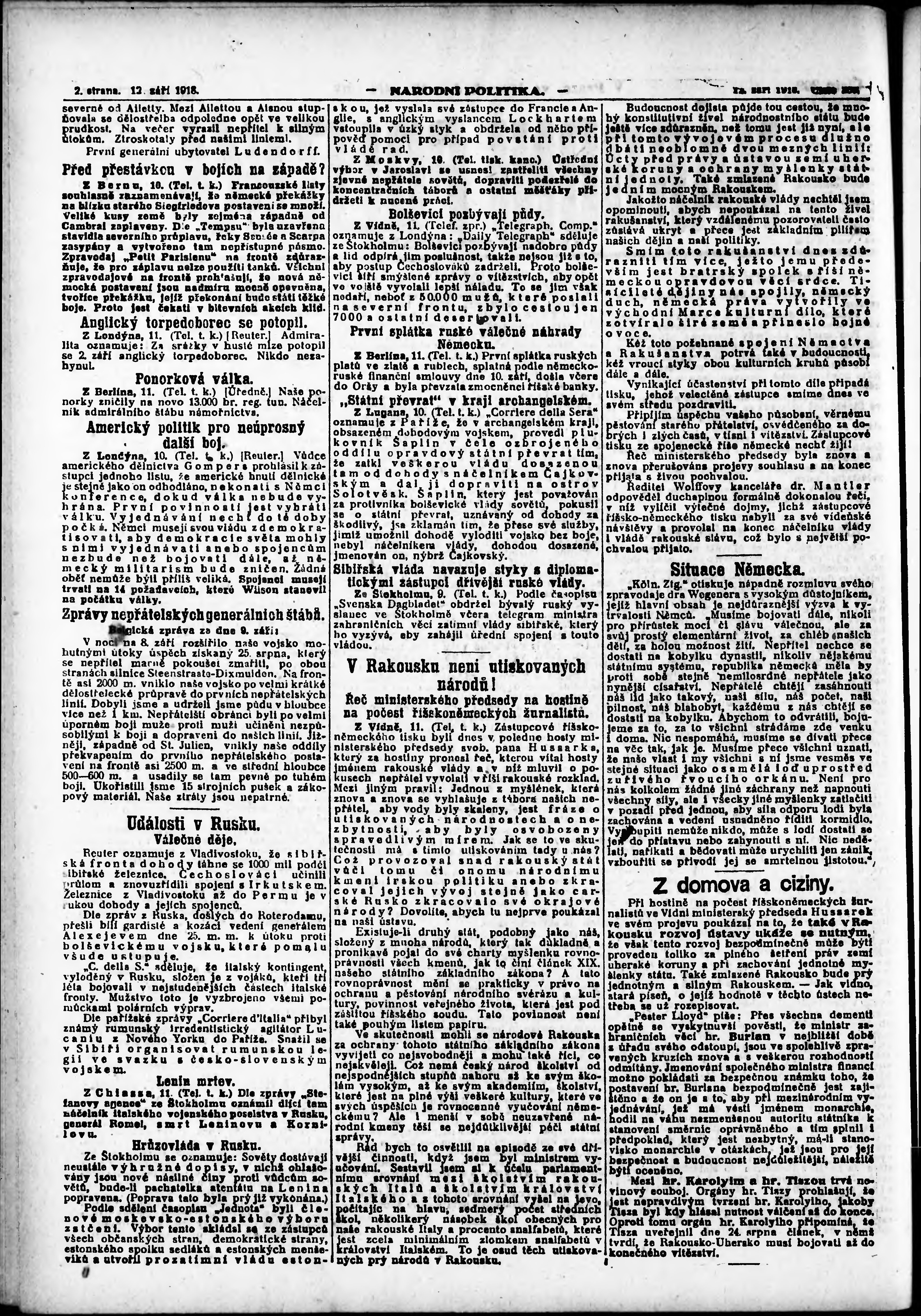 * Datum vydání výtisku: 12.9.1918 Číslo výtisku: 209 Poznámky k výtisku: ranní vydání; vydání pro Prahu;
