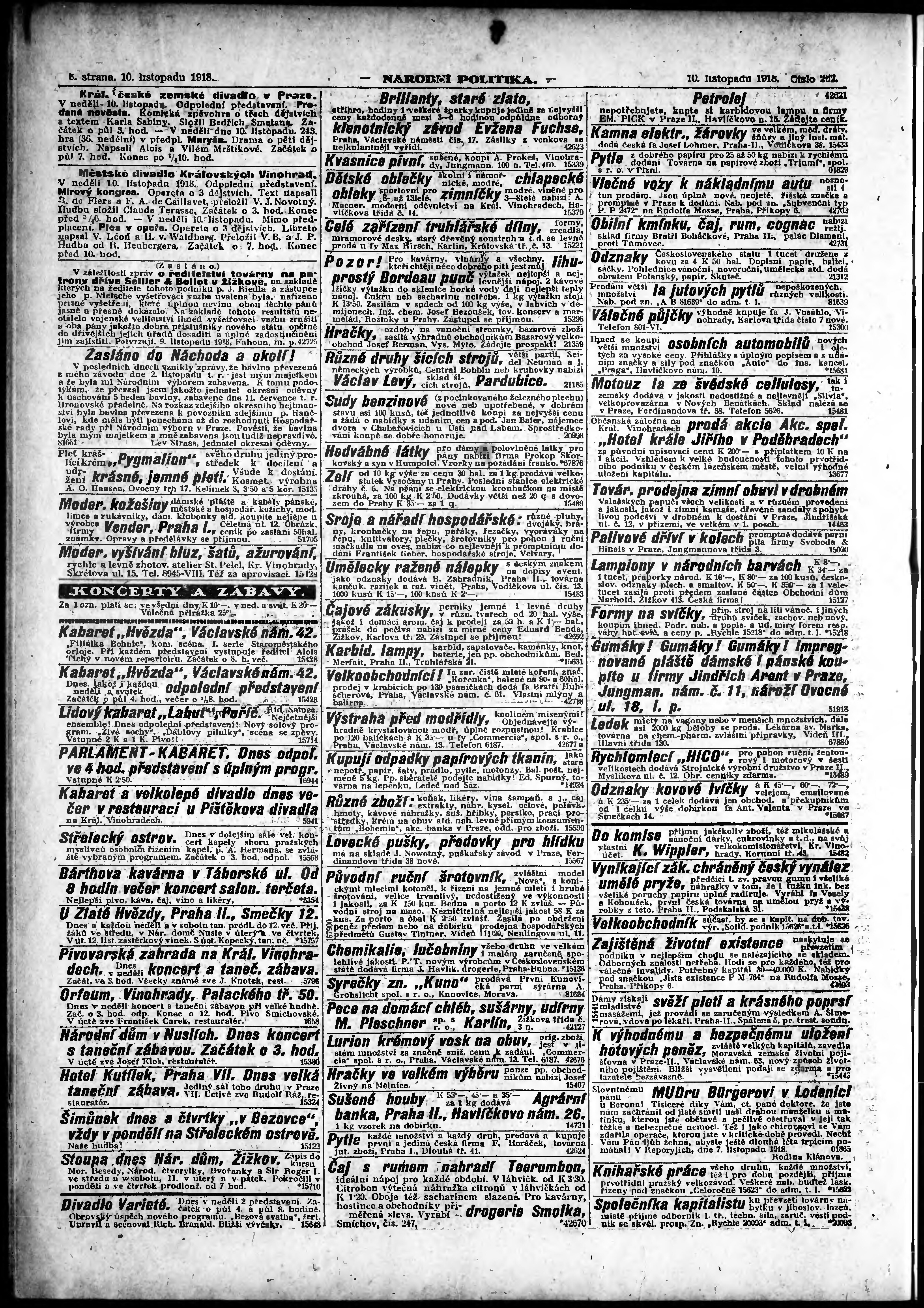* Datum vydání výtisku: 10.11.1918 Číslo výtisku: 262 Poznámky k výtisku: ranní vydání;
