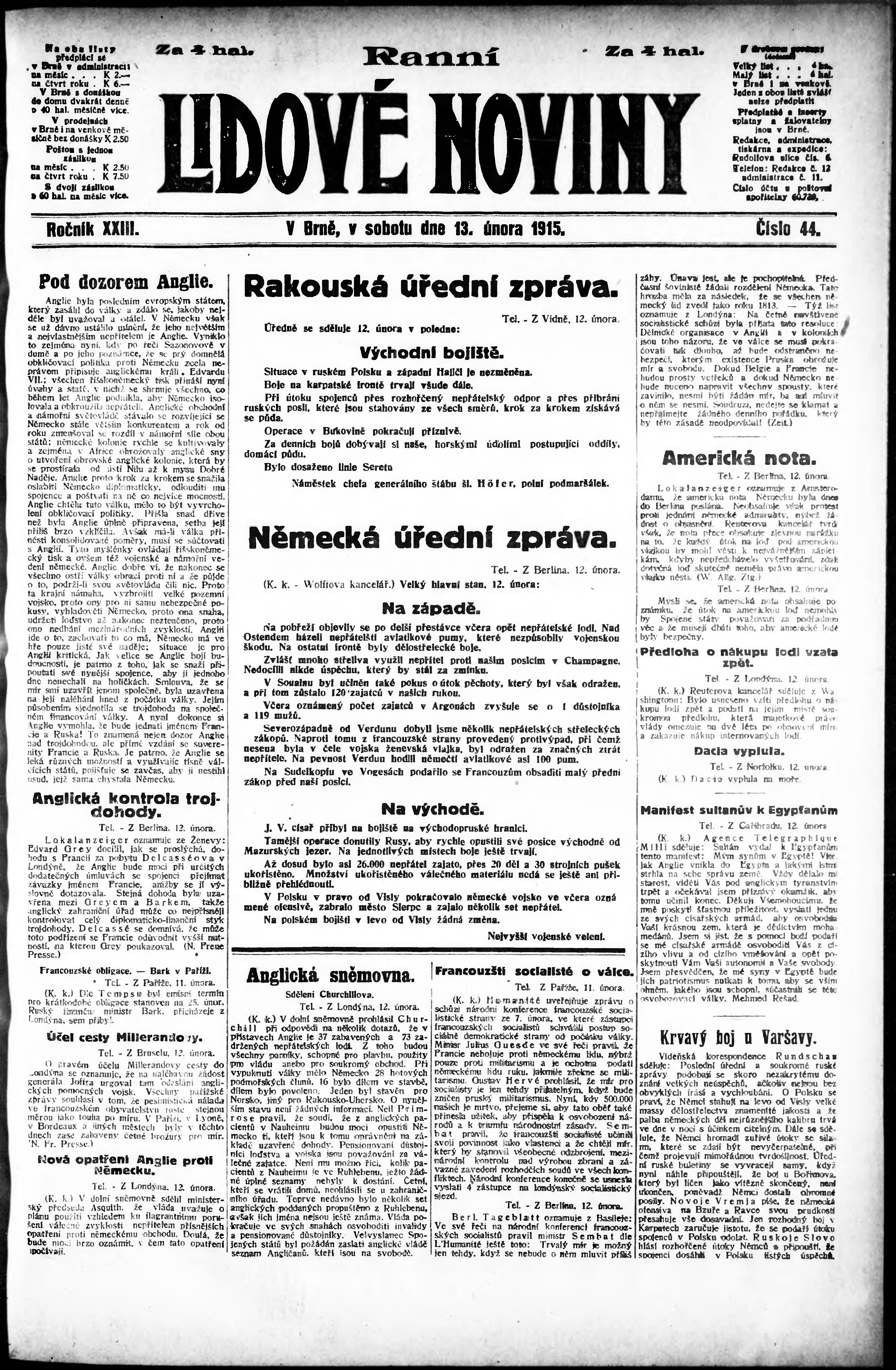 * Datum vydání výtisku: 13.2.1915 Číslo výtisku: 44 Poznámky k výtisku: ranní vydání;