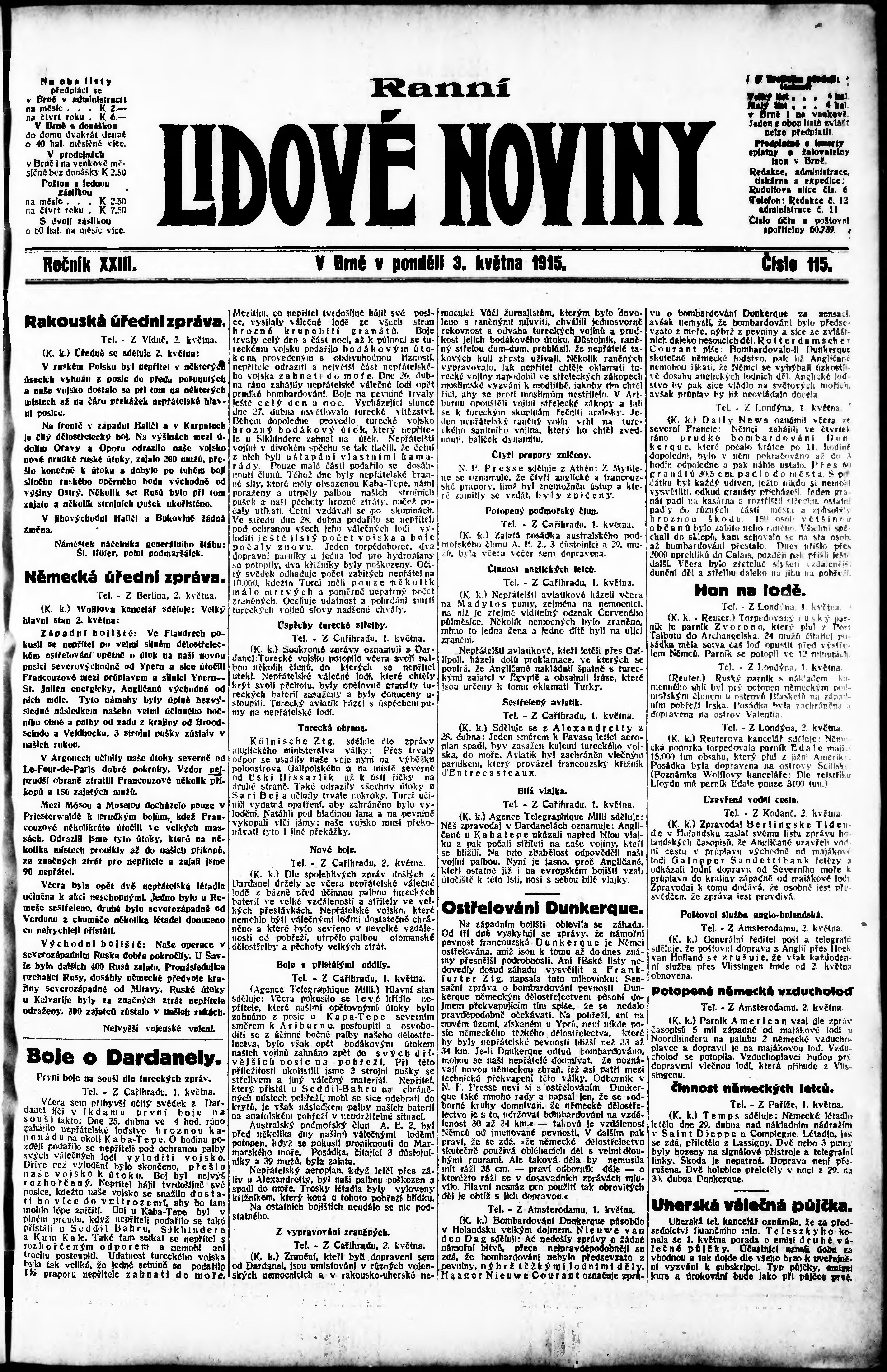 * Datum vydání výtisku: 3.5.1915 Číslo výtisku: 115 Poznámky k výtisku: ranní vydání;