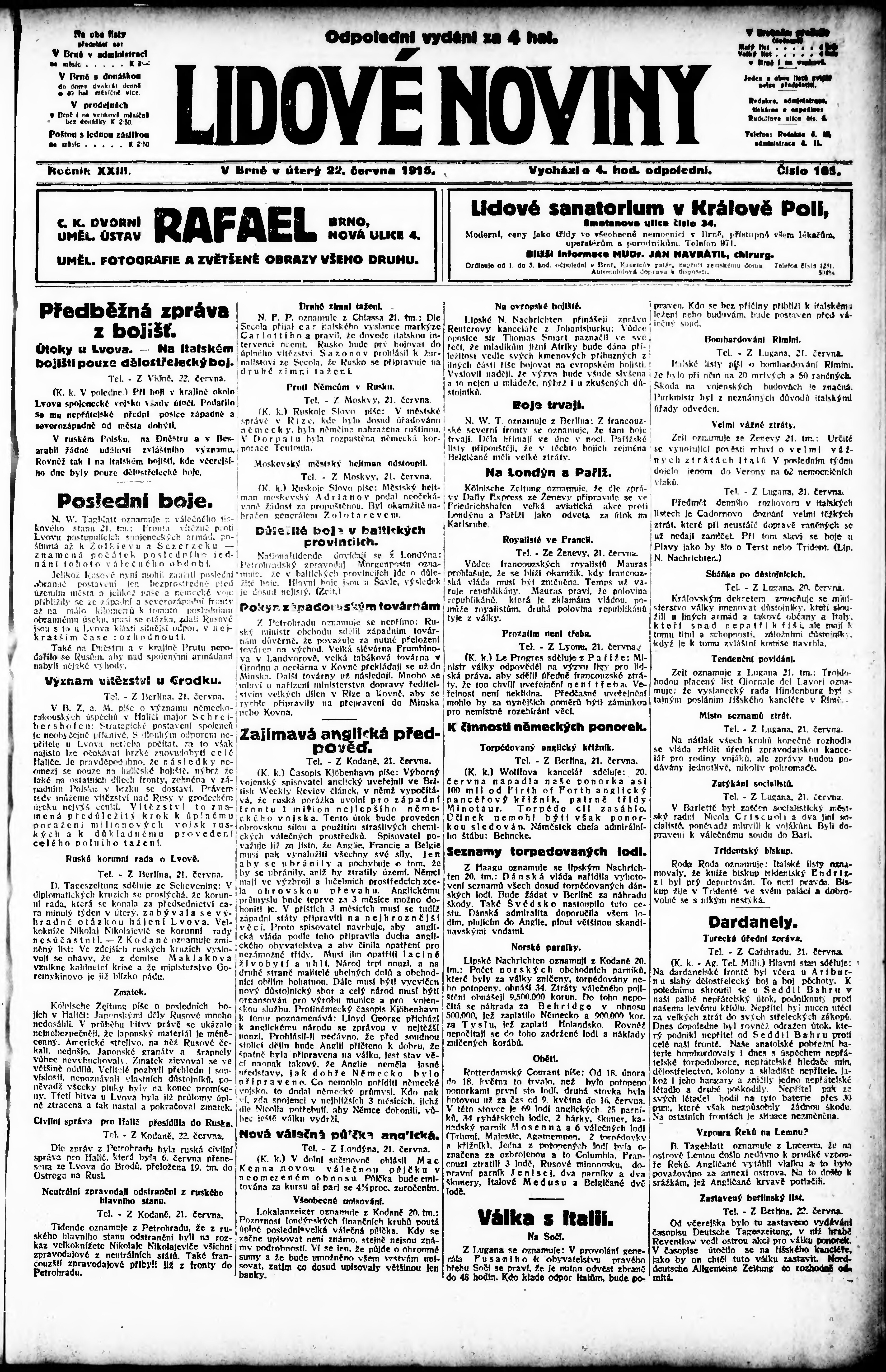 * Datum vydání výtisku: 22.6.1915 Číslo výtisku: 165 Poznámky k výtisku: odpolední vydání;