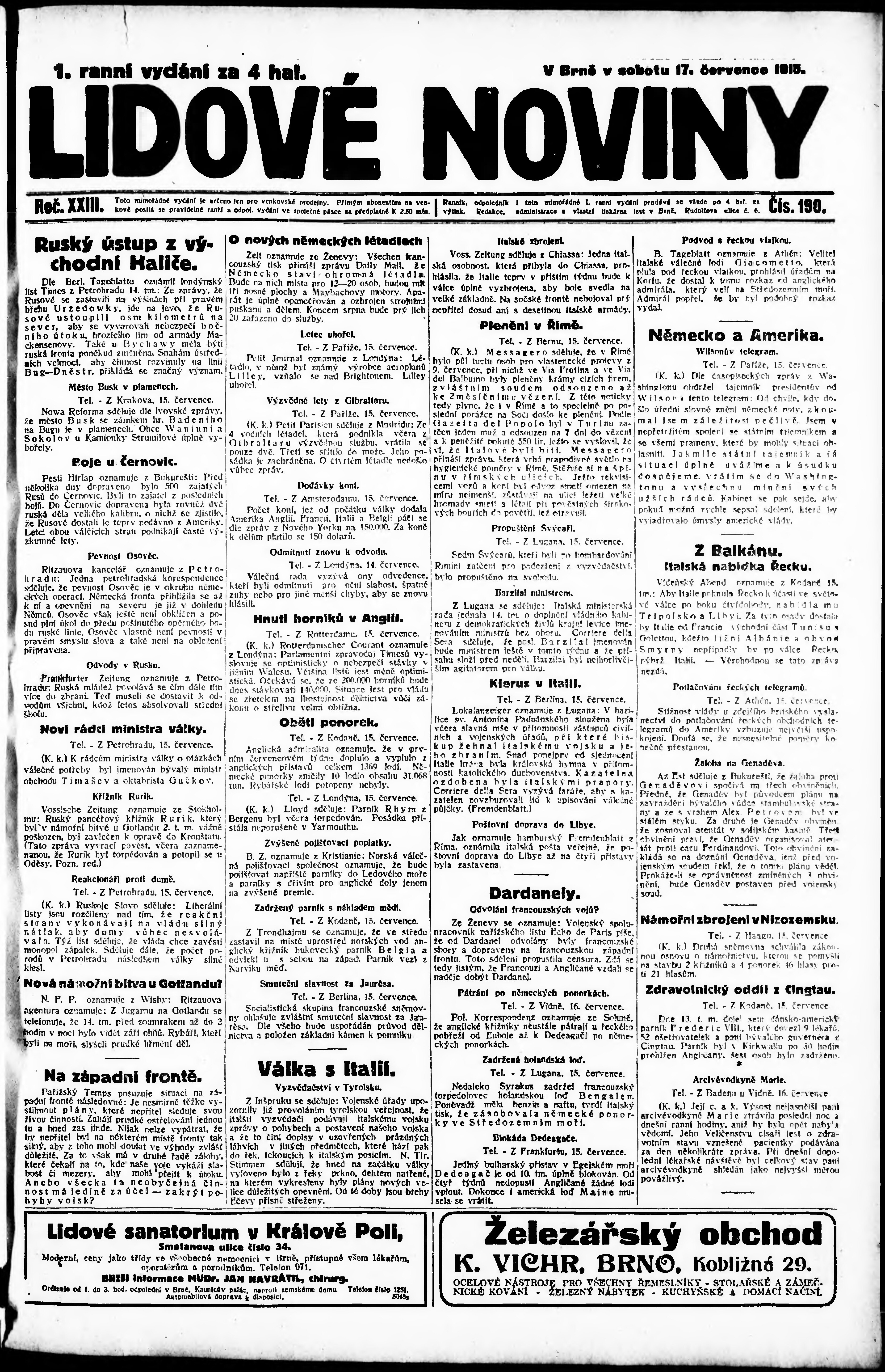 * Datum vydání výtisku: 17.7.1915 Číslo výtisku: 190 Poznámky k výtisku: 1. ranní vydání;