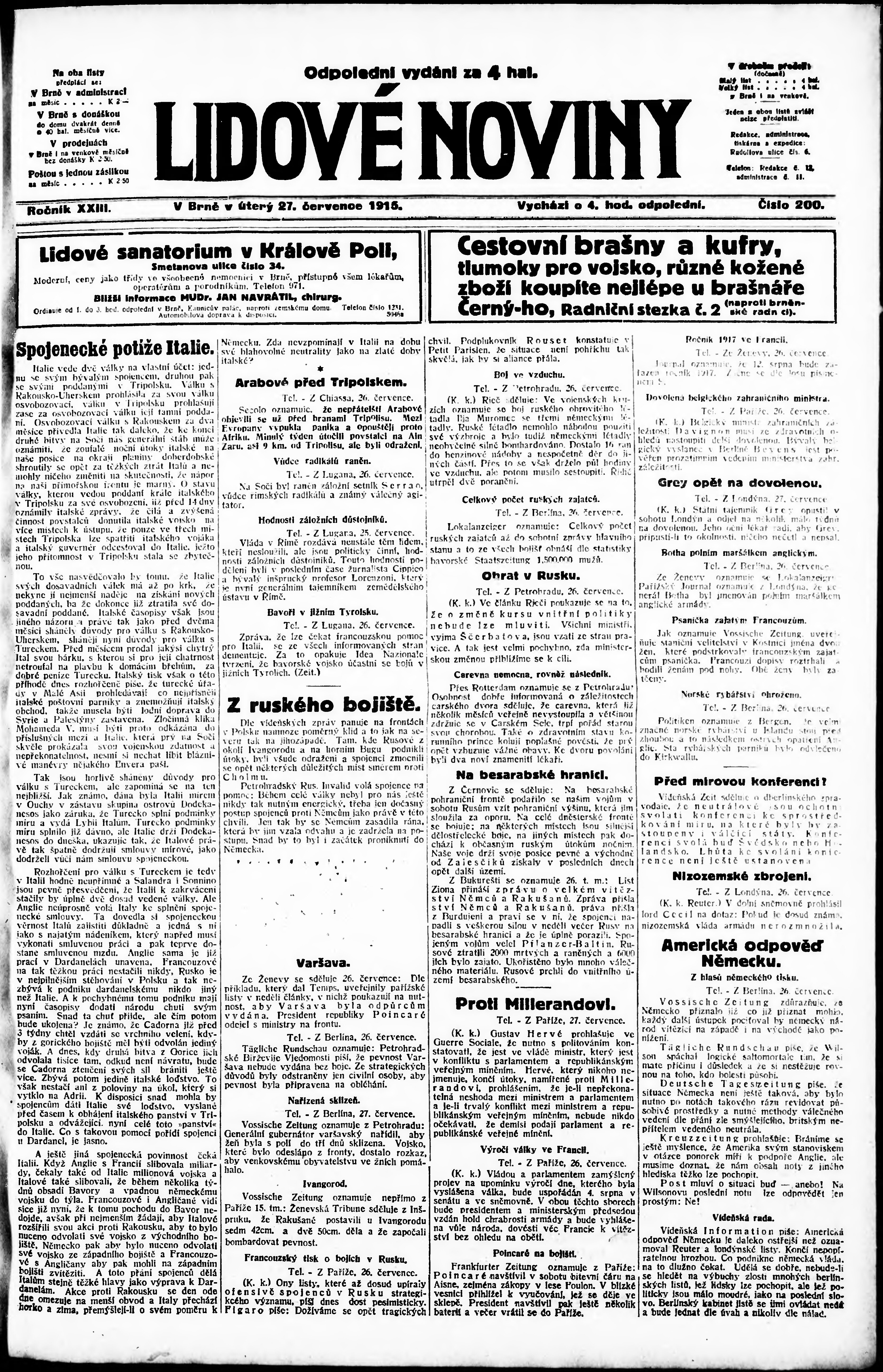 * Datum vydání výtisku: 27.7.1915 Číslo výtisku: 200 Poznámky k výtisku: odpolední vydání;