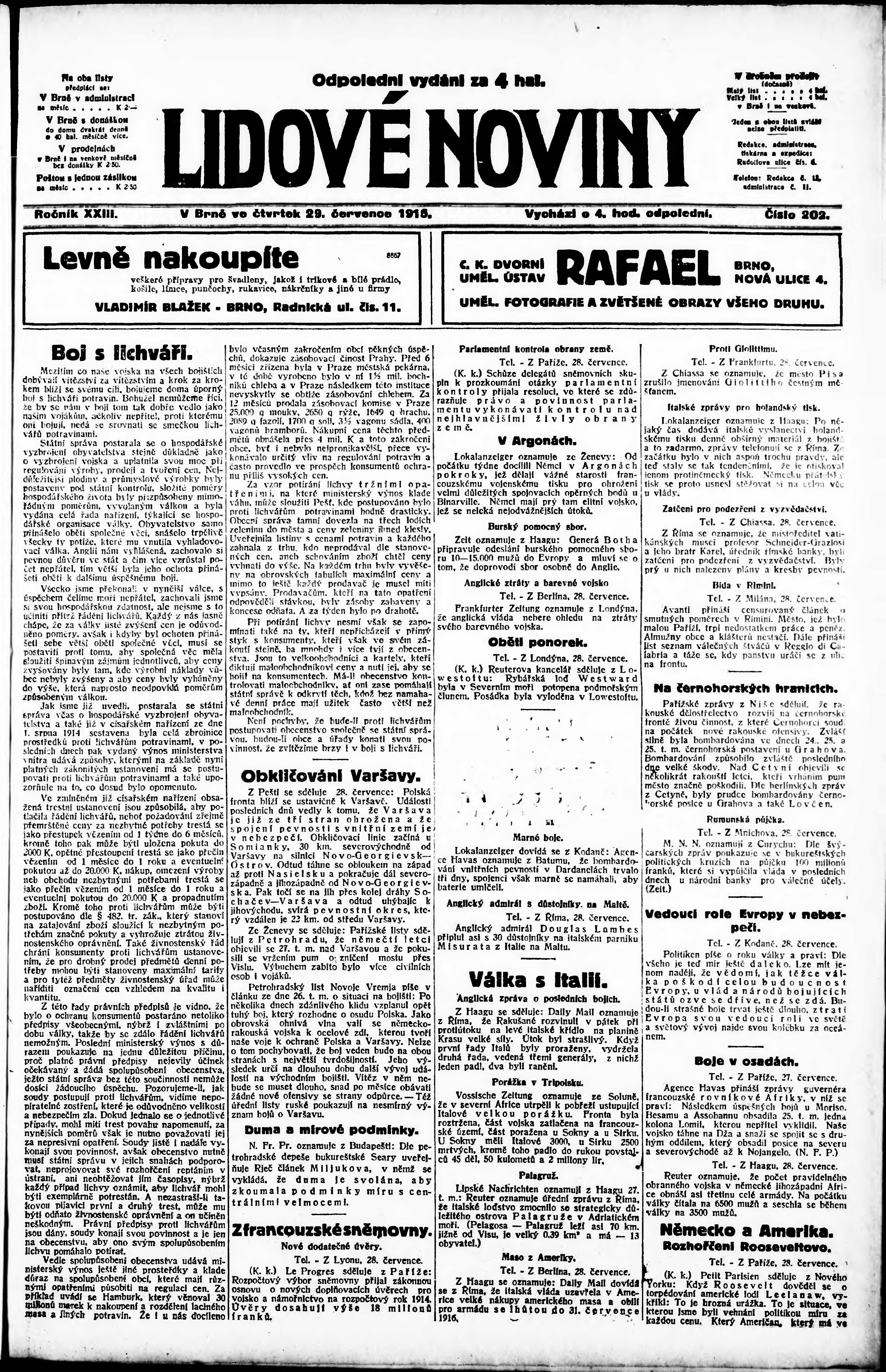 * Datum vydání výtisku: 29.7.1915 Číslo výtisku: 202 Poznámky k výtisku: odpolední vydání;