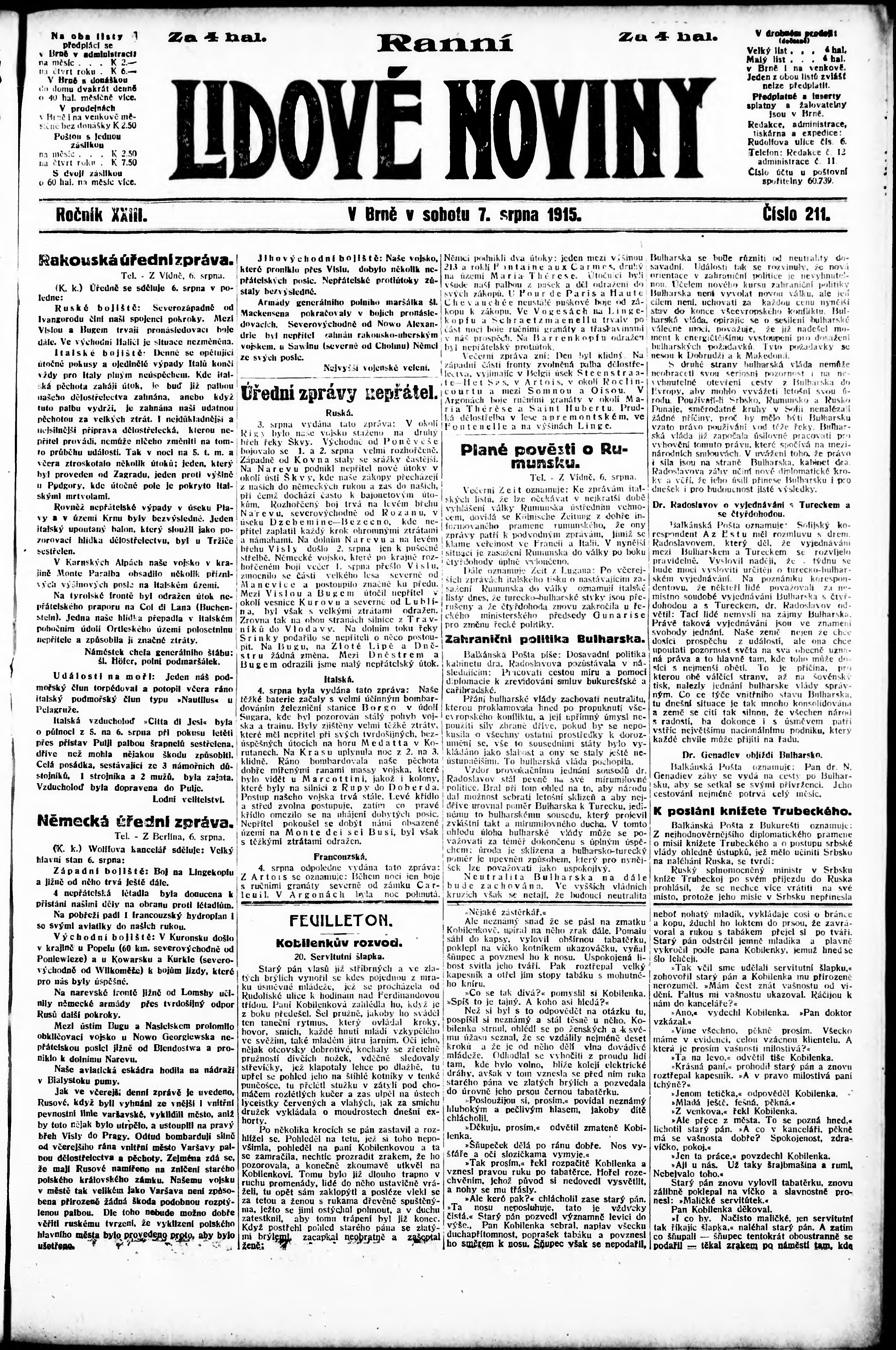 * Datum vydání výtisku: 7.8.1915 Číslo výtisku: 211 Poznámky k výtisku: ranní vydání;
