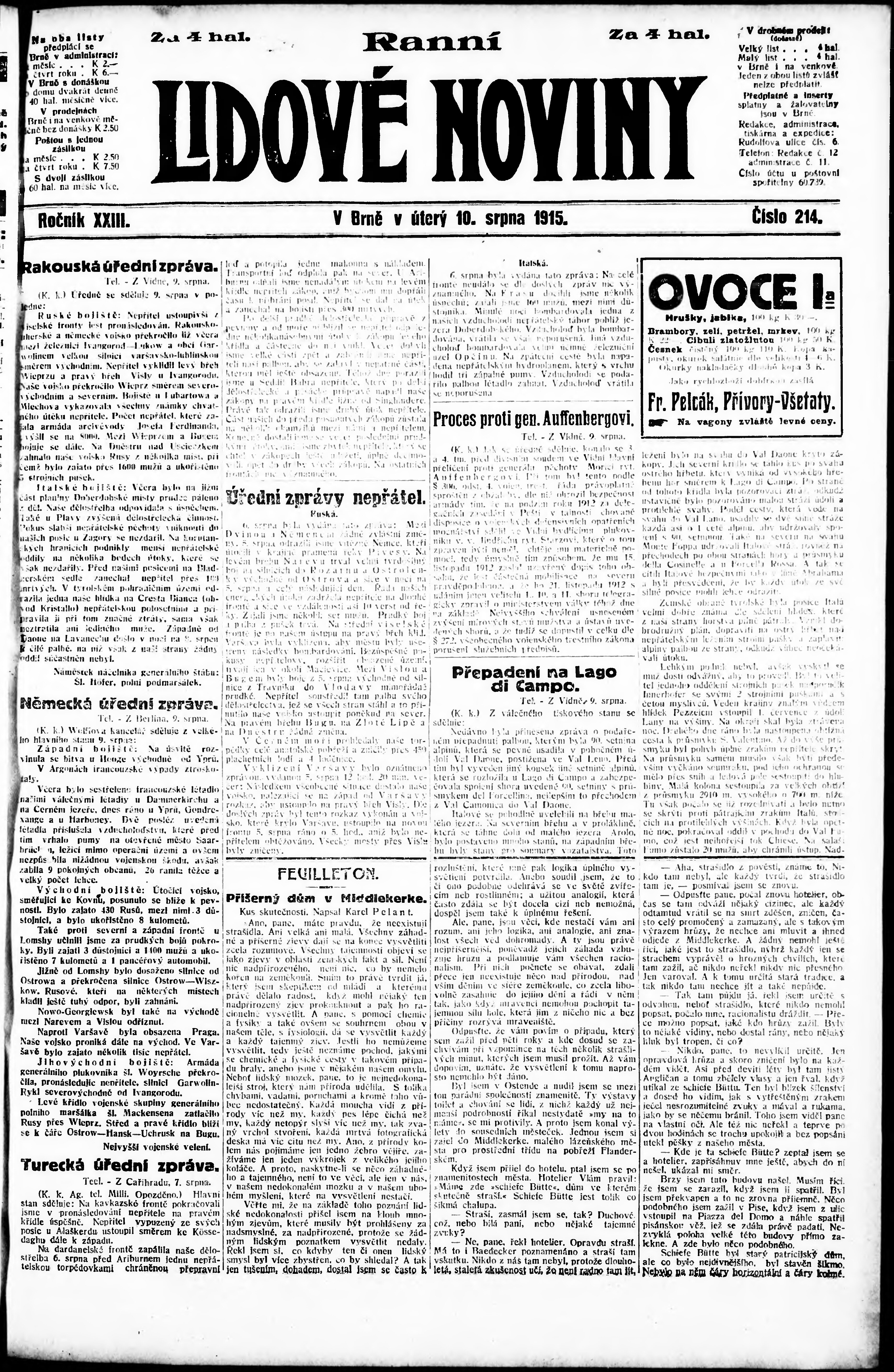 * Datum vydání výtisku: 10.8.1915 Číslo výtisku: 214 Poznámky k výtisku: ranní vydání;