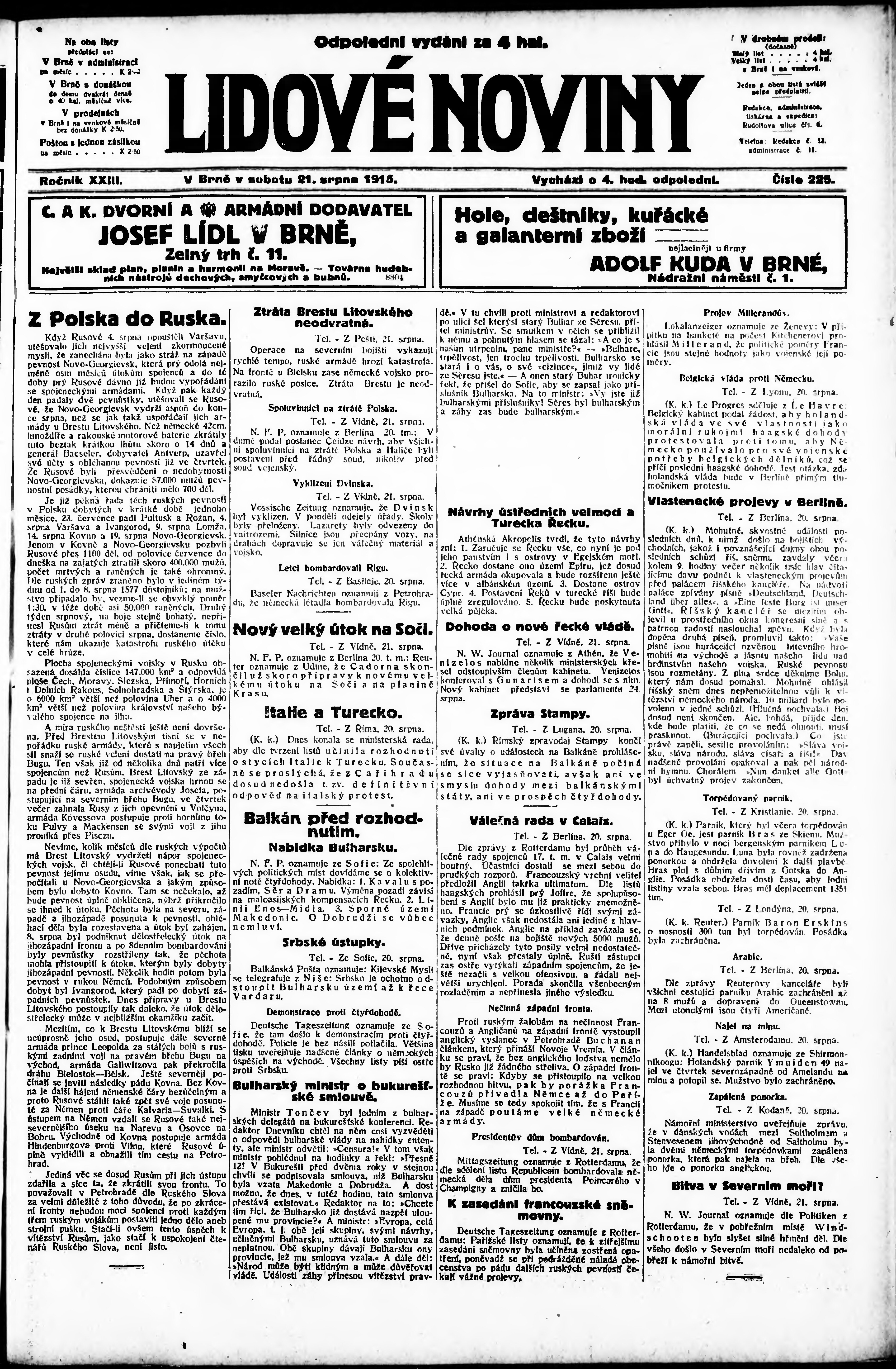 * Datum vydání výtisku: 21.8.1915 Číslo výtisku: 225 Poznámky k výtisku: odpolední vydání;