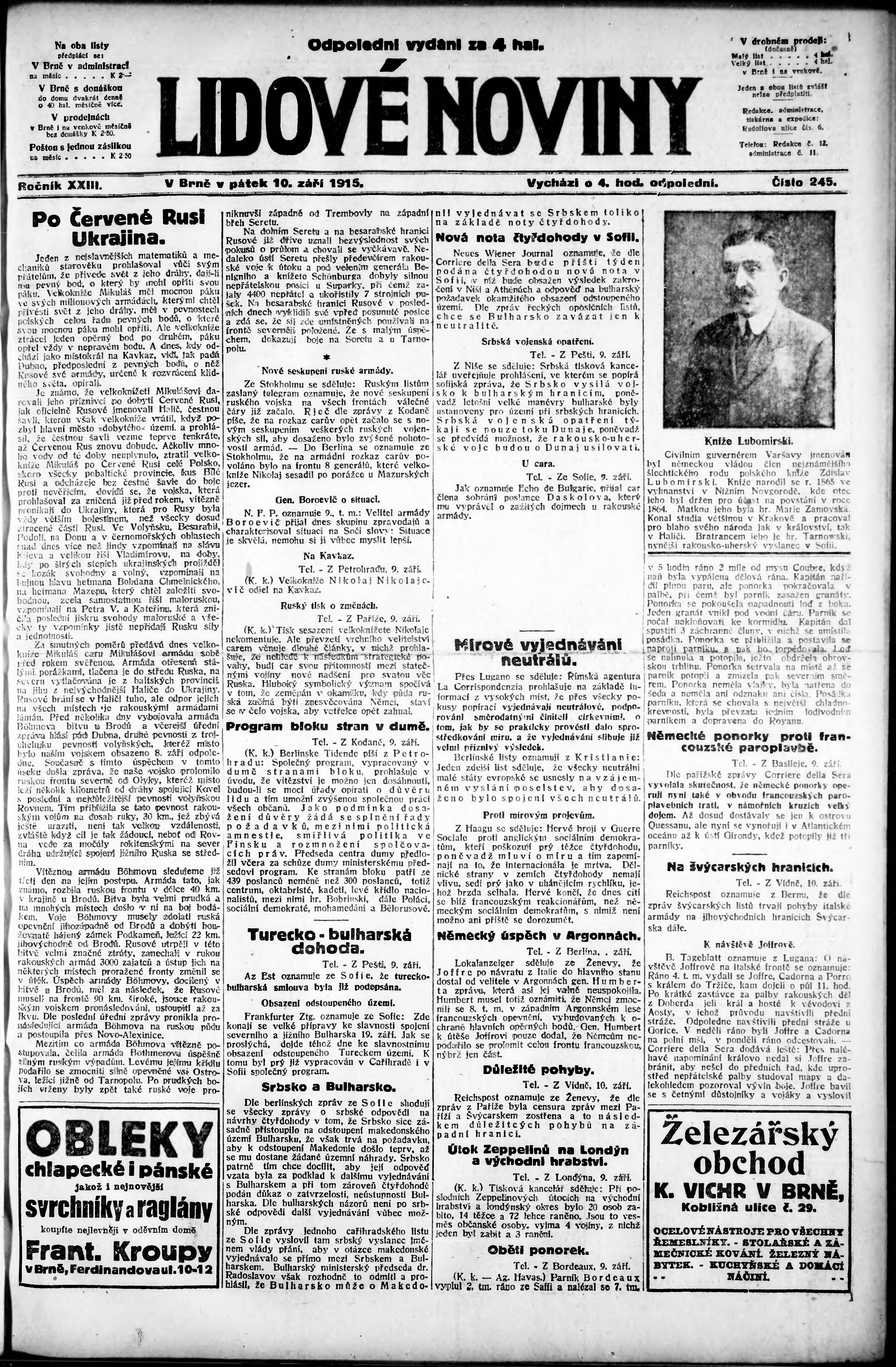 * Datum vydání výtisku: 10.9.1915 Číslo výtisku: 245 Poznámky k výtisku: odpolední vydání;