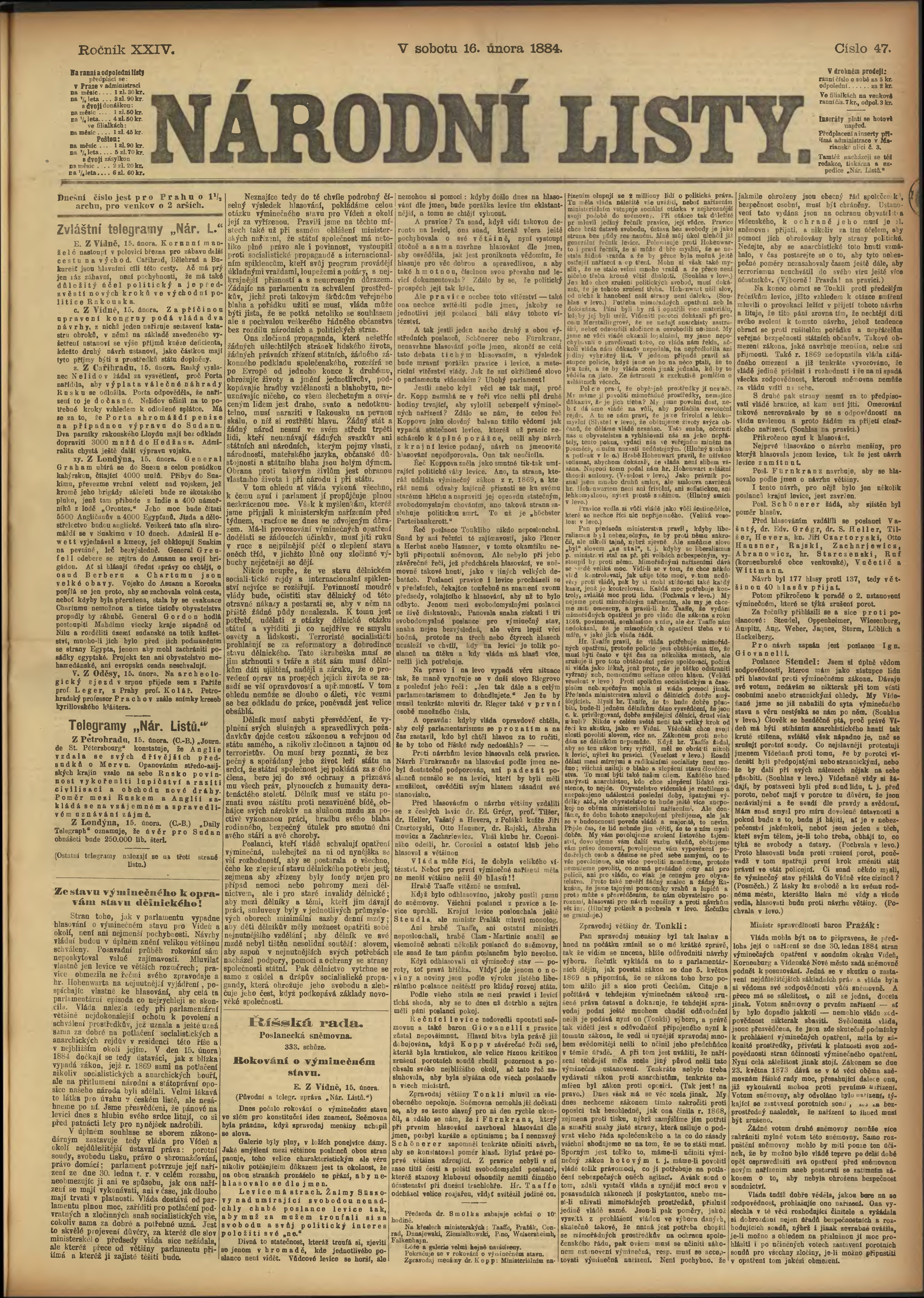 * Datum vydání výtisku: 16.2.1884 Číslo výtisku: 47