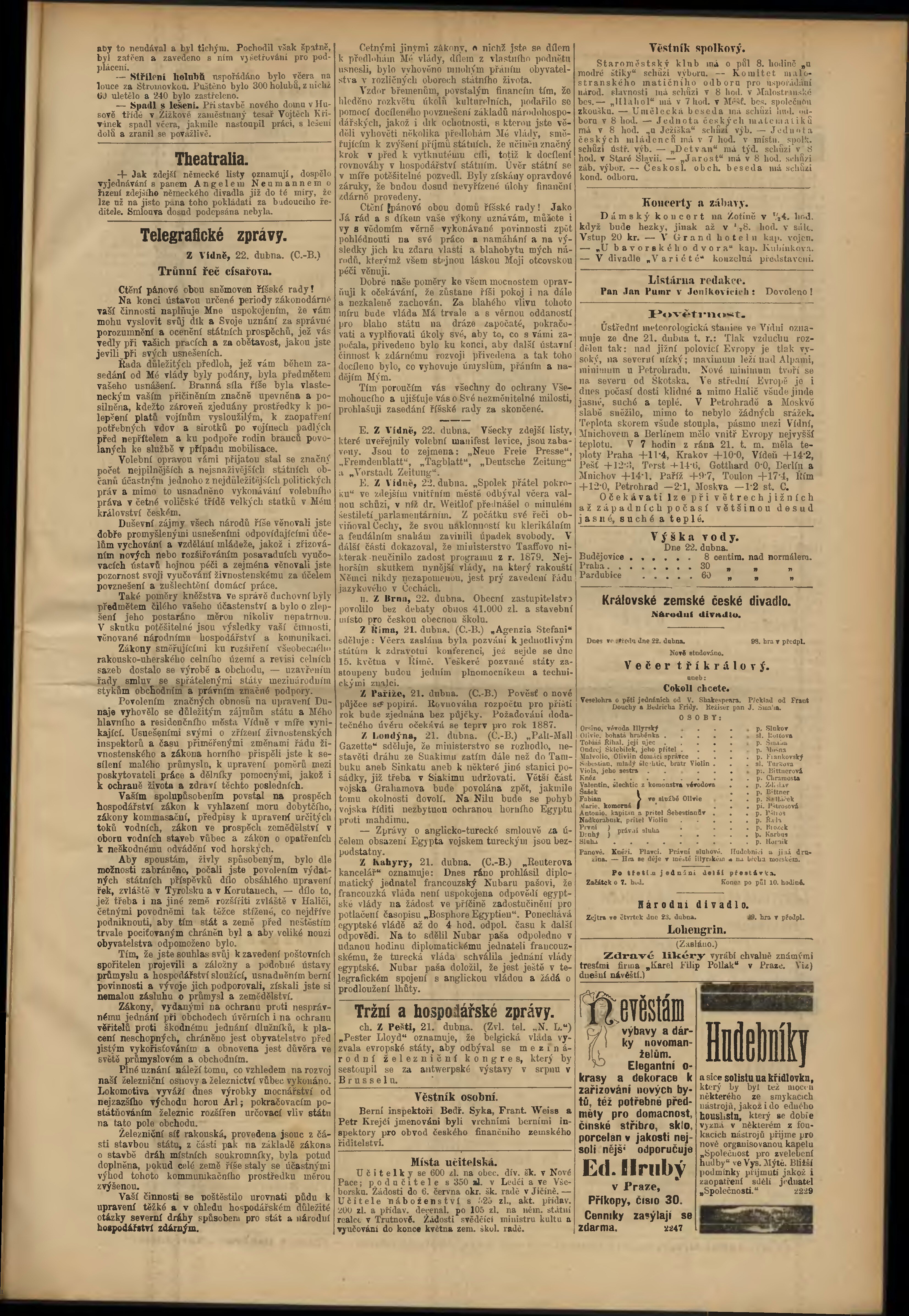* Datum vydání výtisku: 22.4.1885 Číslo výtisku: 110 Poznámky k výtisku: odpolední vydání;
