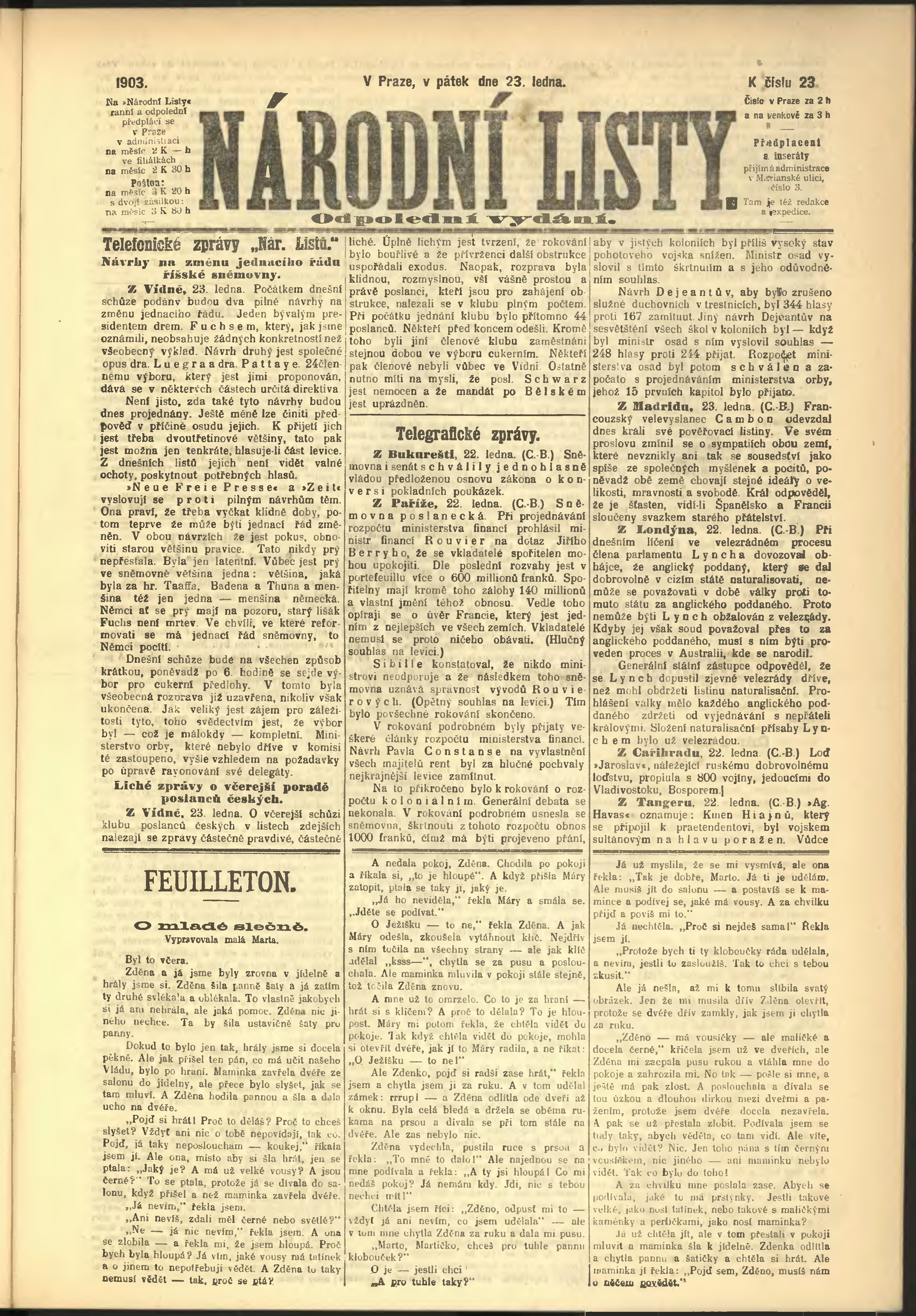 * Datum vydání výtisku: 23.1.1903 Číslo výtisku: 23 Poznámky k výtisku: odpolední vydání;