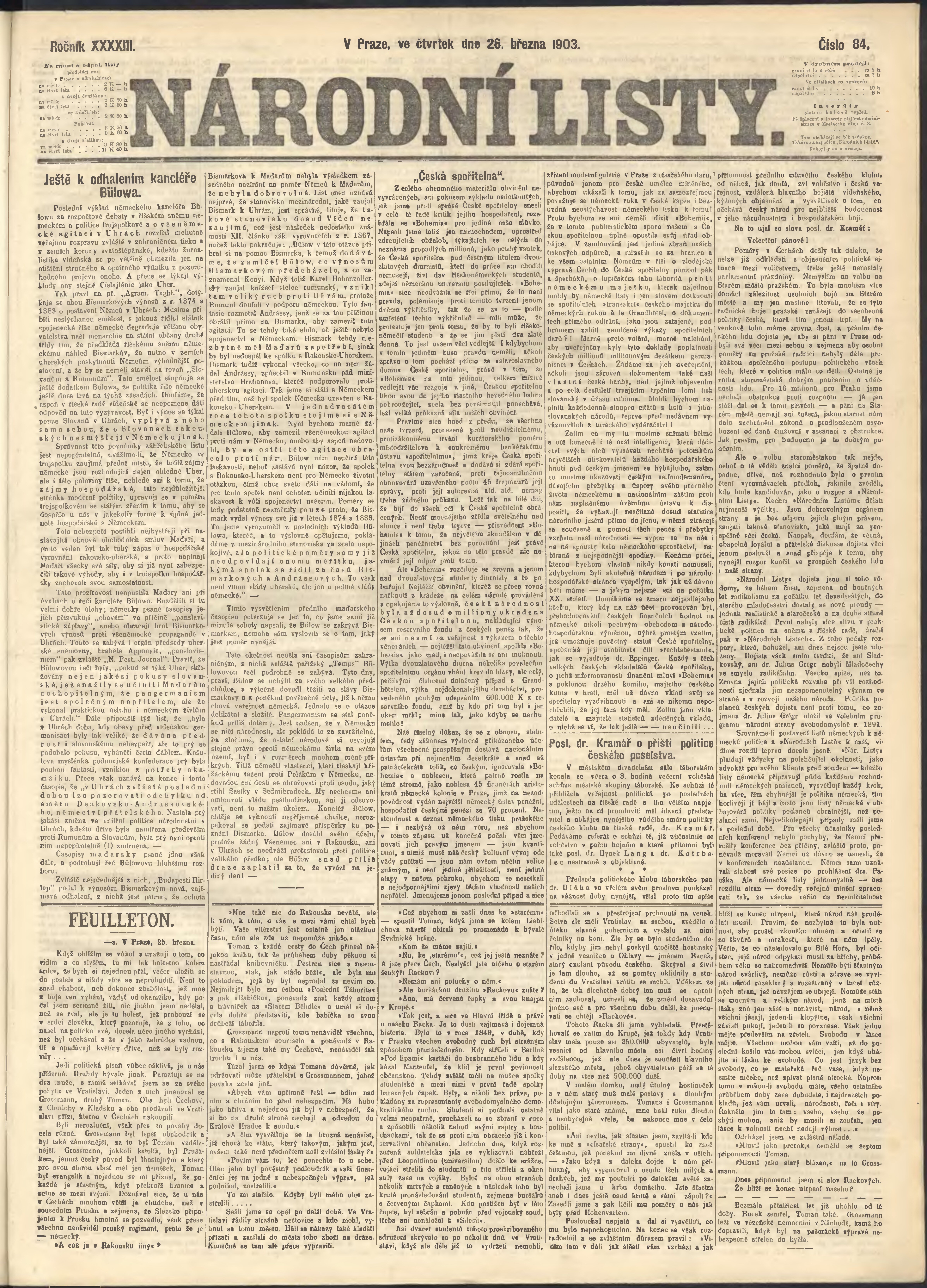 * Datum vydání výtisku: 26.3.1903 Číslo výtisku: 84 Poznámky k výtisku: ranní vydání;