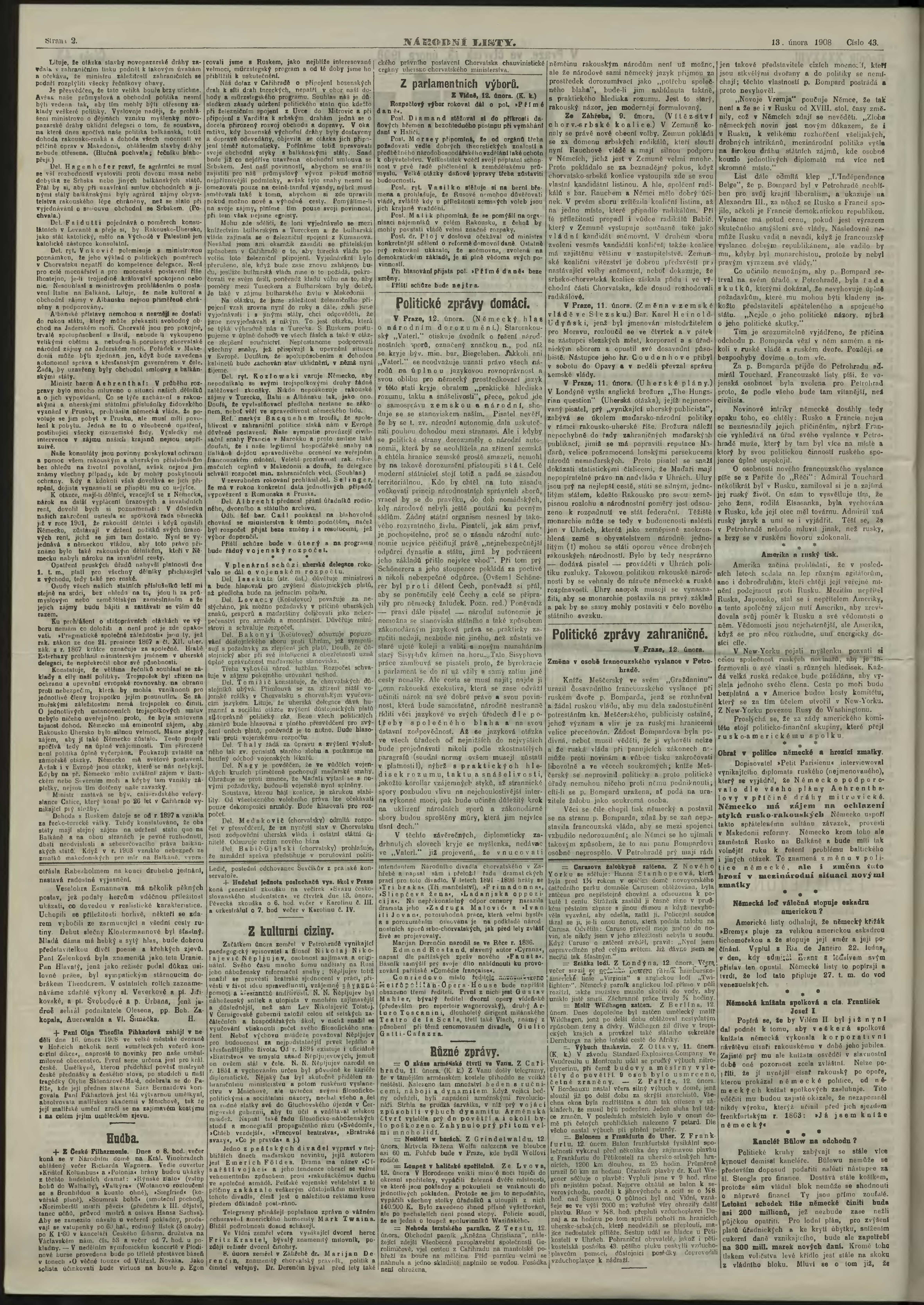 * Datum vydání výtisku: 13.2.1908 Číslo výtisku: 43 Poznámky k výtisku: ranní vydání;