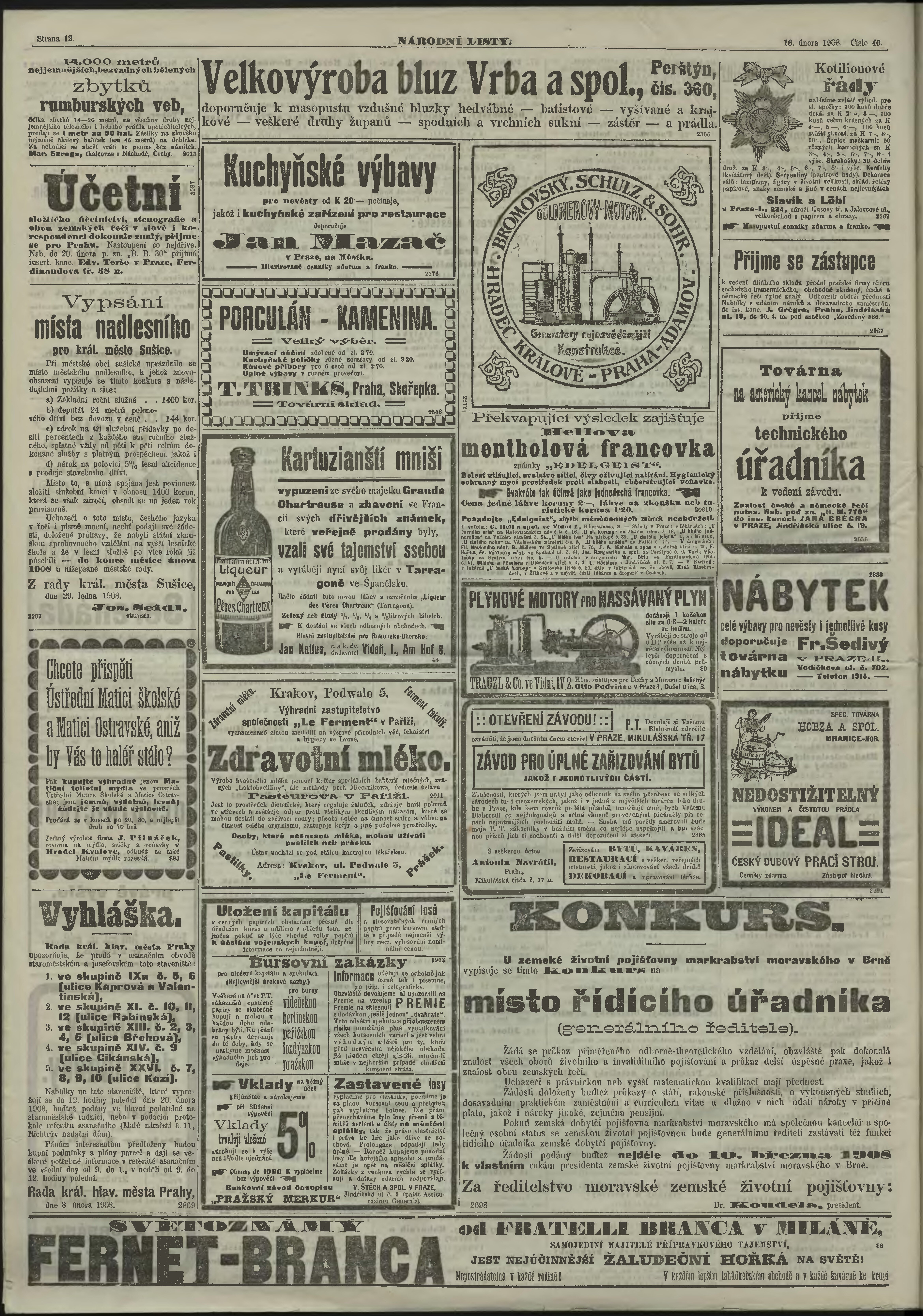 * Datum vydání výtisku: 16.2.1908 Číslo výtisku: 46 Poznámky k výtisku: ranní vydání;