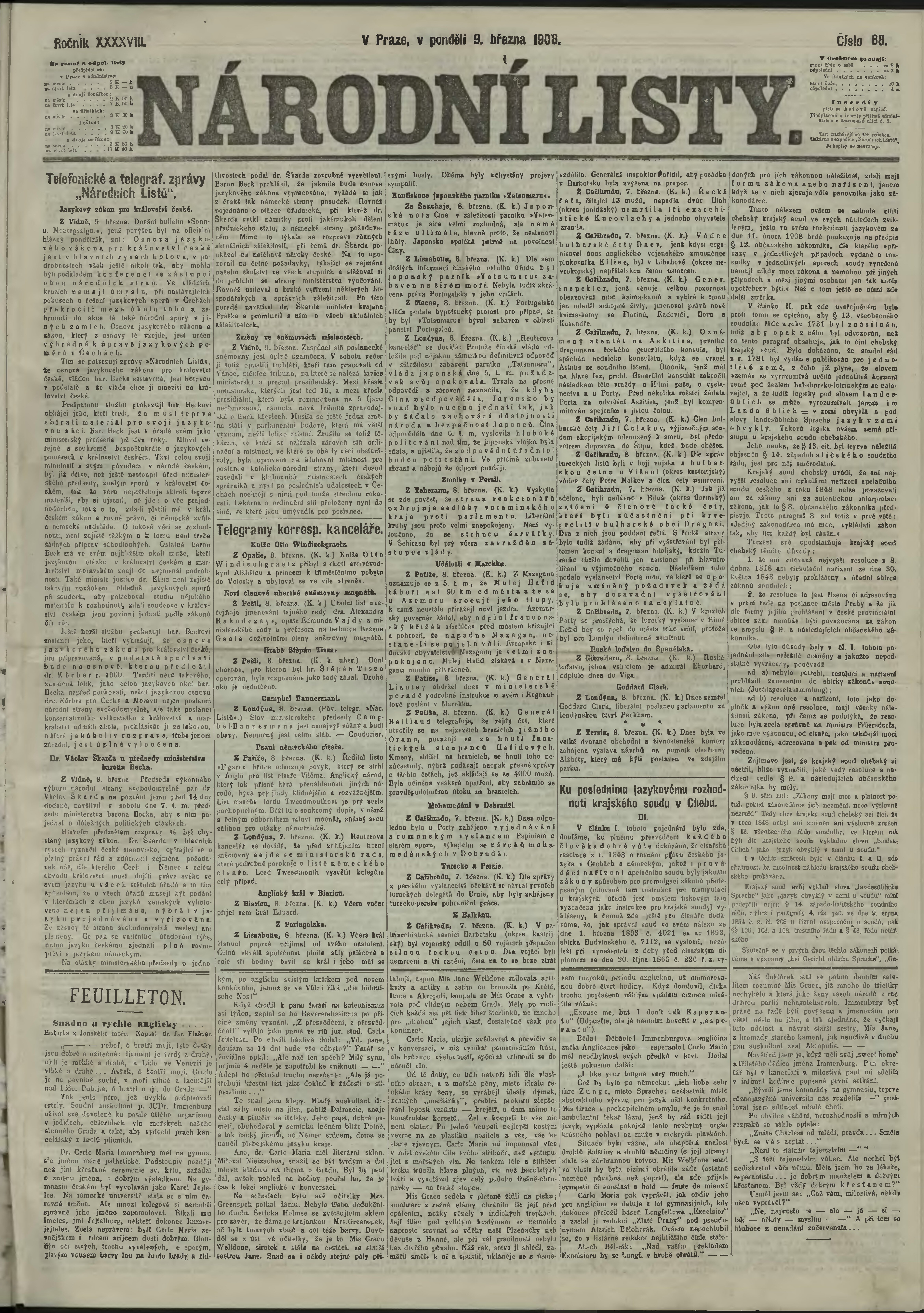 * Datum vydání výtisku: 9.3.1908 Číslo výtisku: 68 Poznámky k výtisku: ranní vydání;