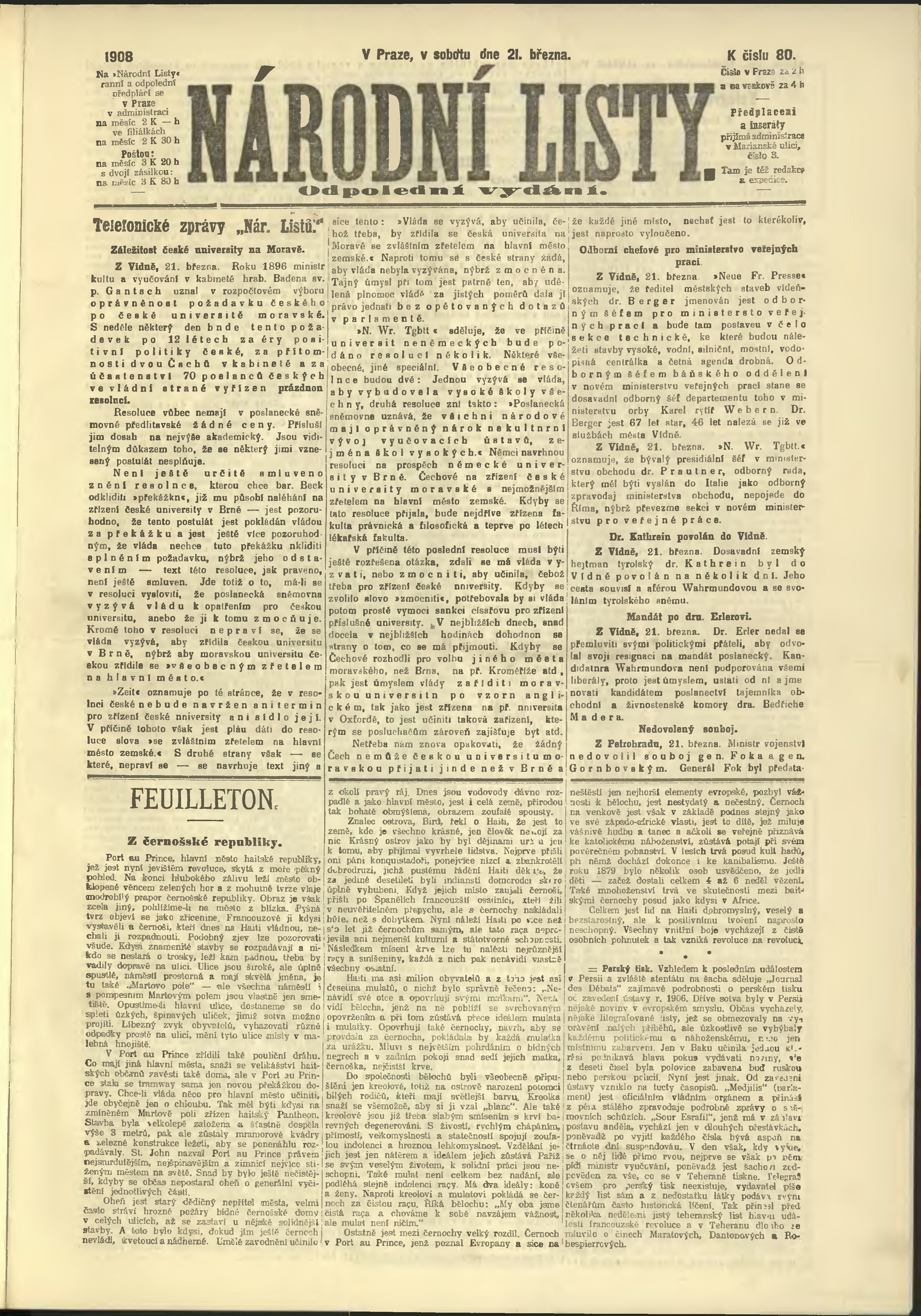 * Datum vydání výtisku: 21.3.1908 Číslo výtisku: 80 Poznámky k výtisku: odpolední vydání;