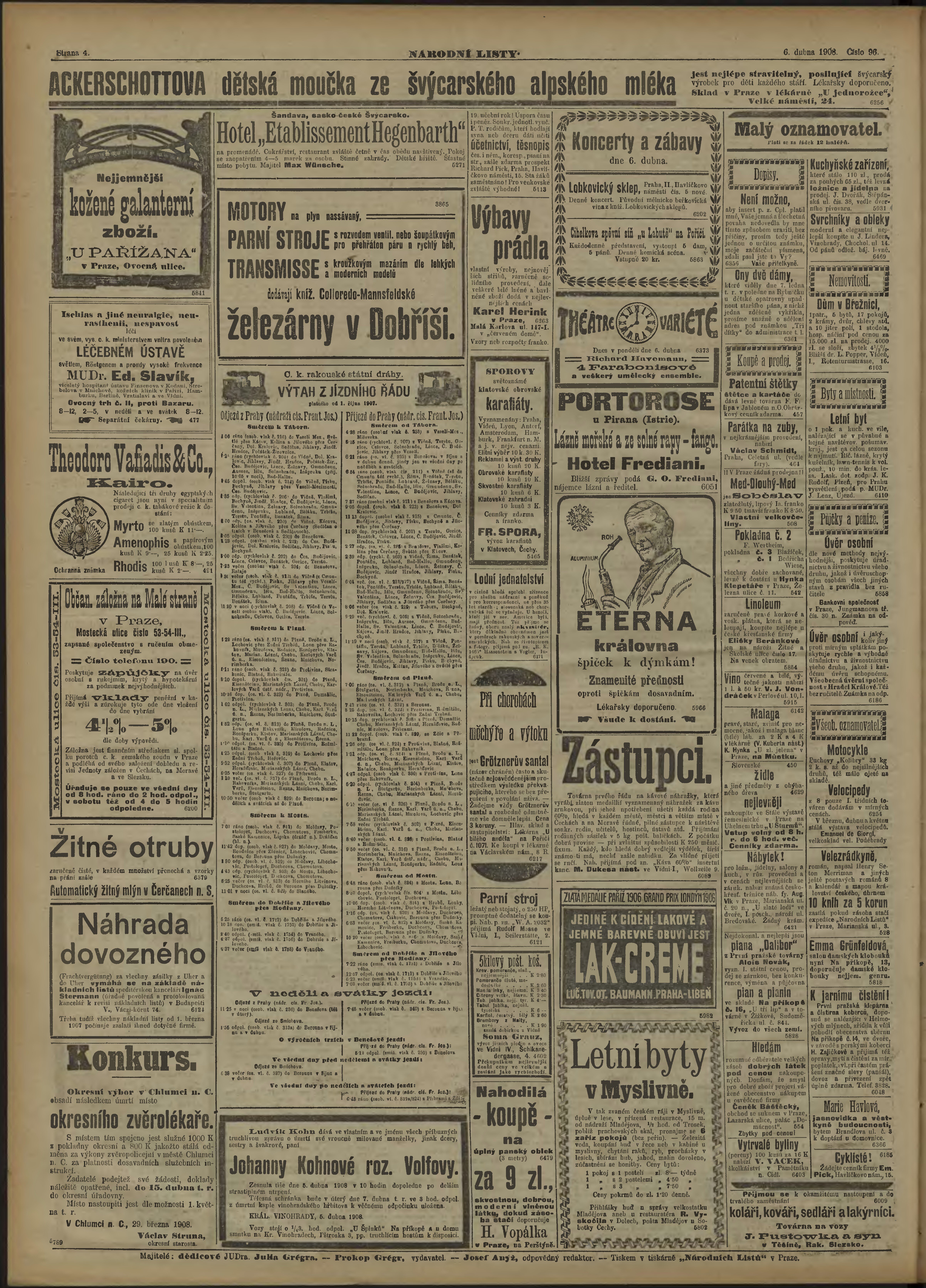 * Datum vydání výtisku: 6.4.1908 Číslo výtisku: 96 Poznámky k výtisku: ranní vydání;