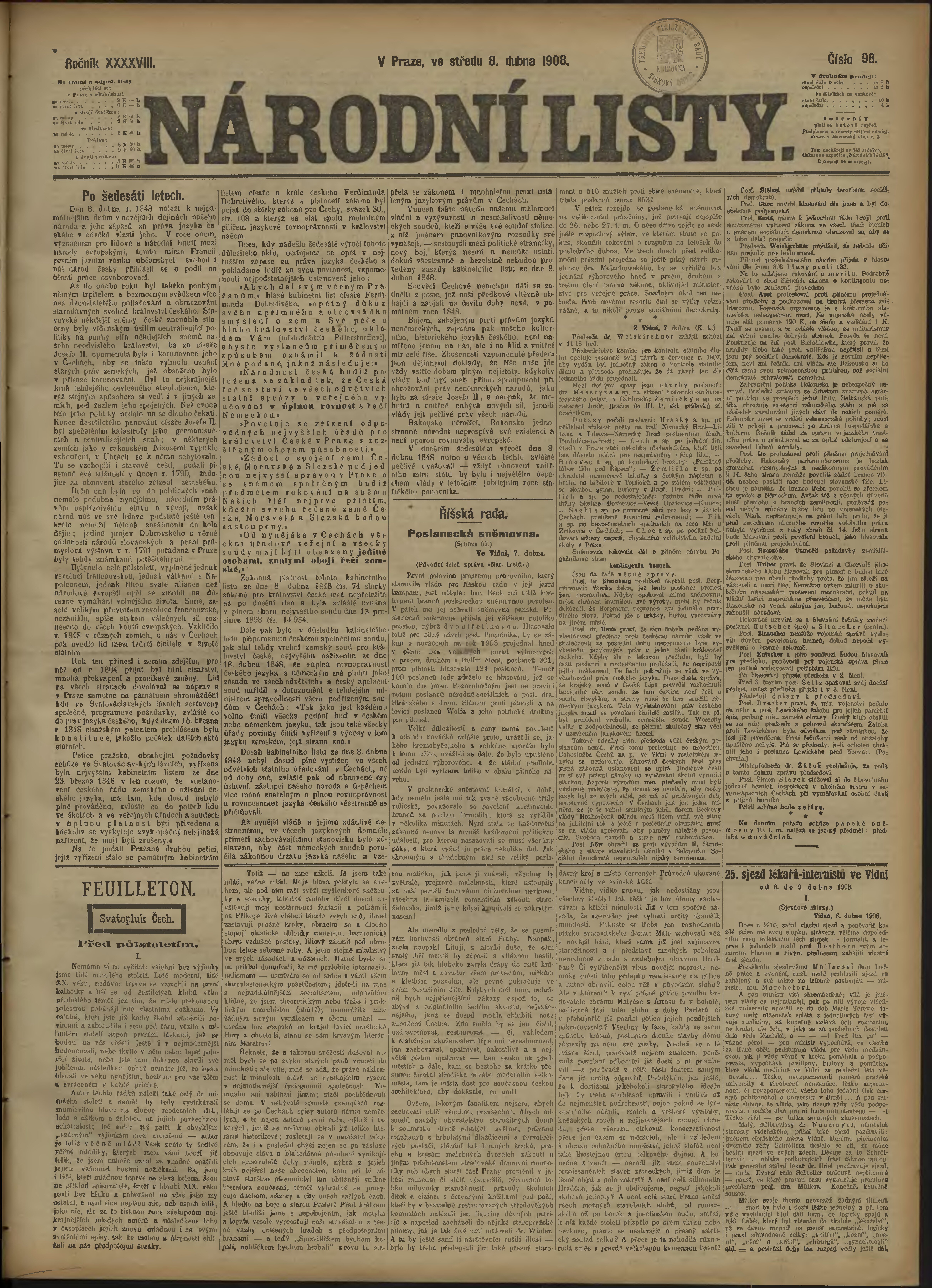 * Datum vydání výtisku: 8.4.1908 Číslo výtisku: 98 Poznámky k výtisku: ranní vydání;