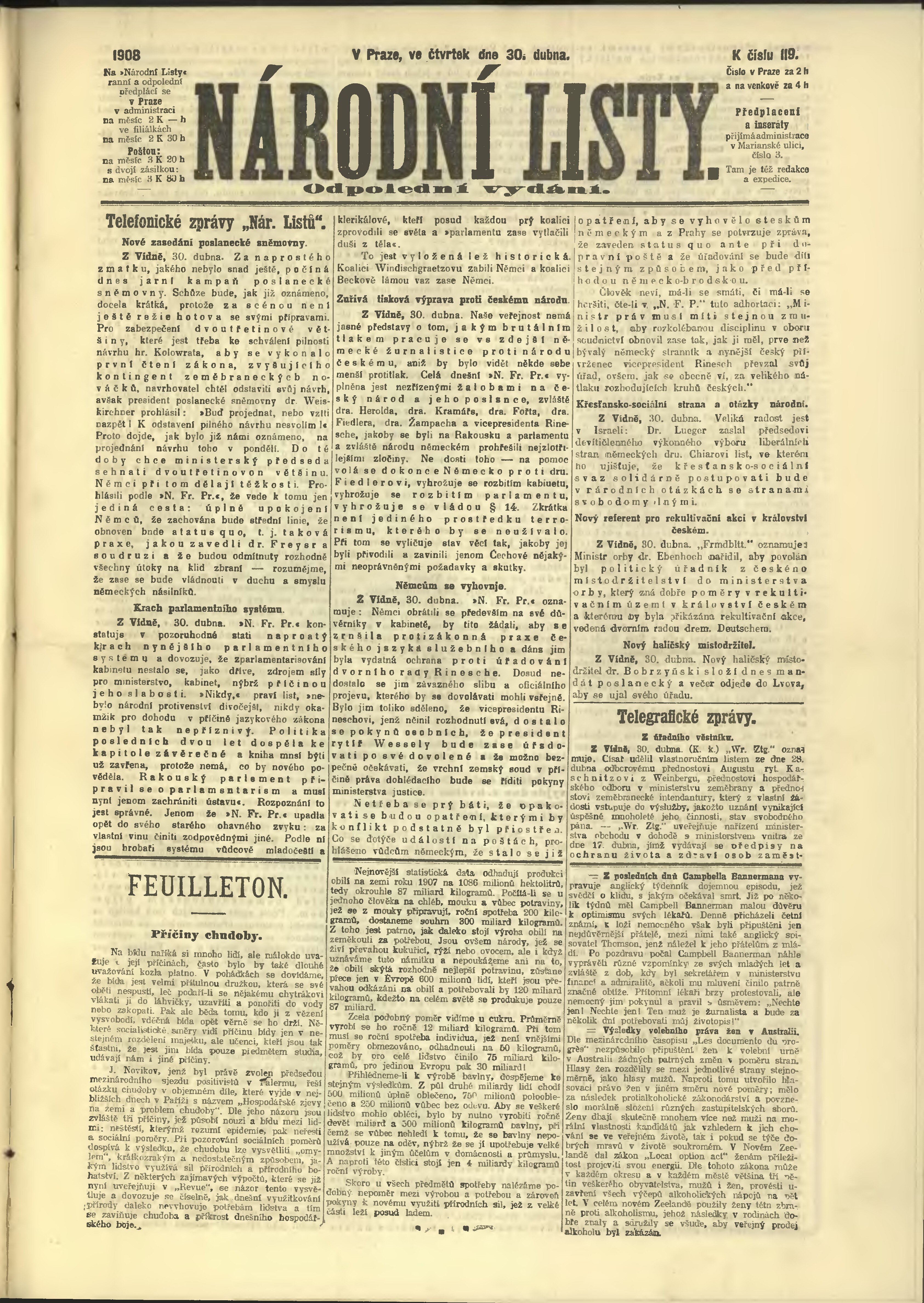 * Datum vydání výtisku: 30.4.1908 Číslo výtisku: 119 Poznámky k výtisku: odpolední vydání;