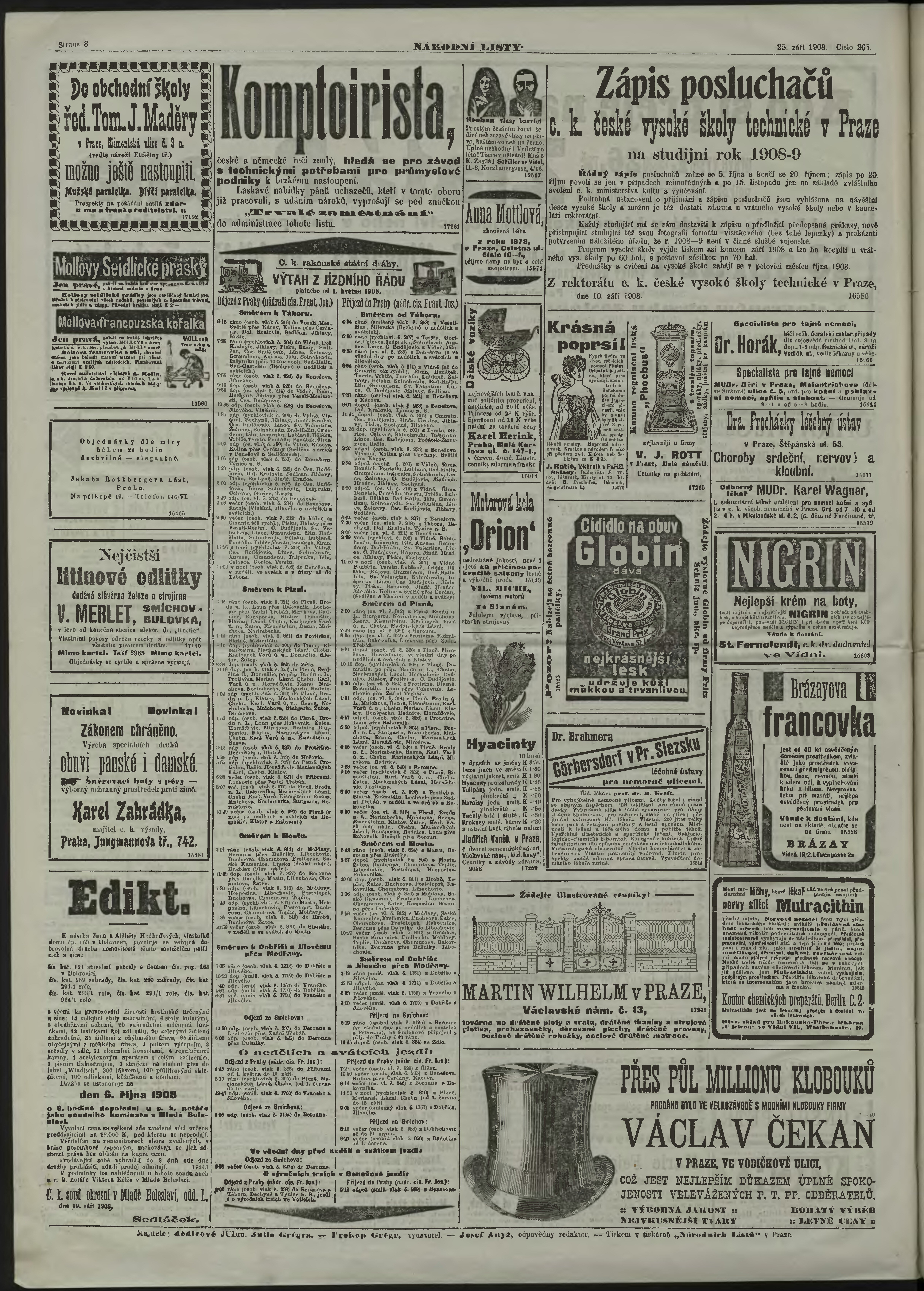 * Datum vydání výtisku: 25.9.1908 Číslo výtisku: 265 Poznámky k výtisku: ranní vydání;
