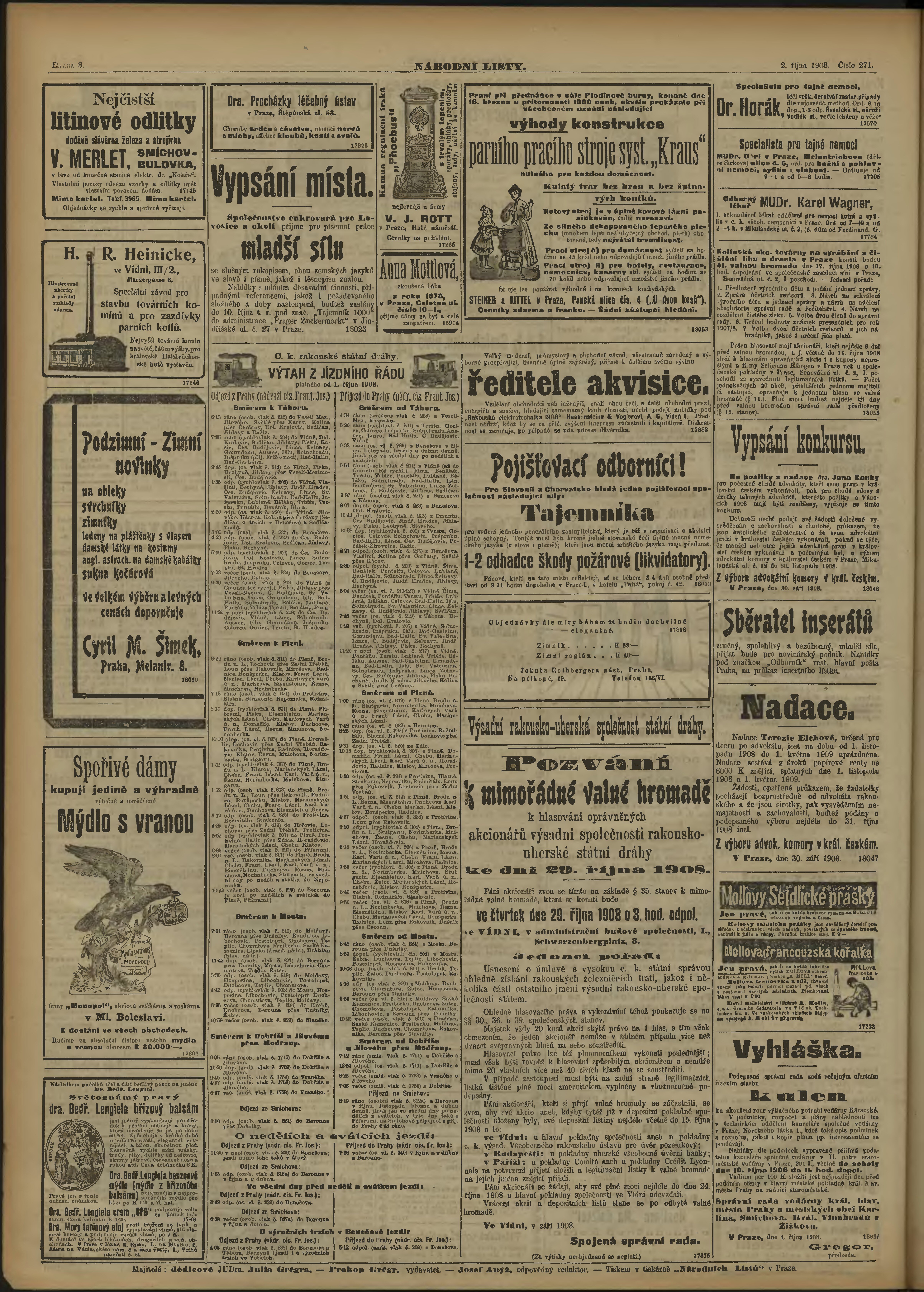 * Datum vydání výtisku: 2.10.1908 Číslo výtisku: 271 Poznámky k výtisku: ranní vydání;